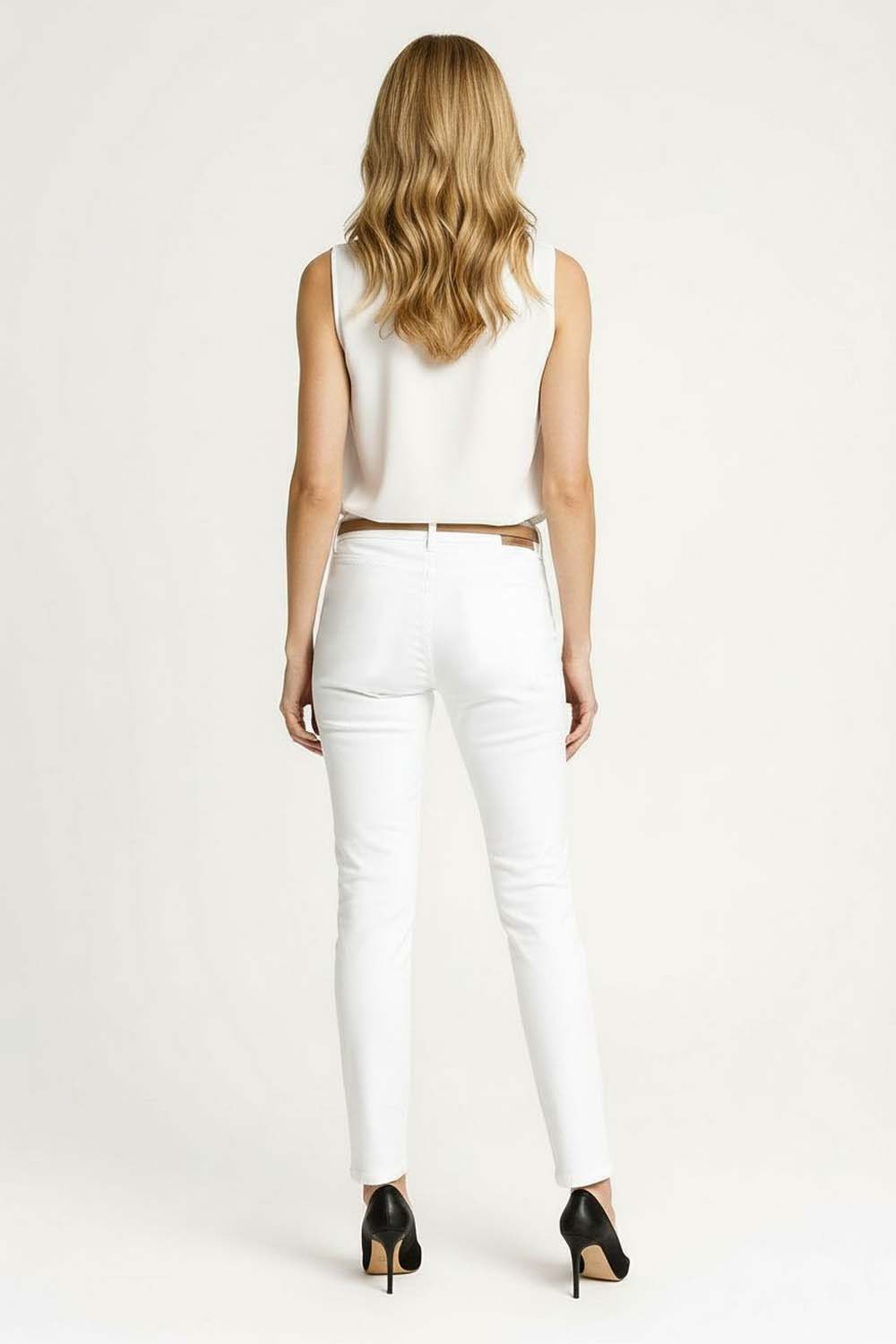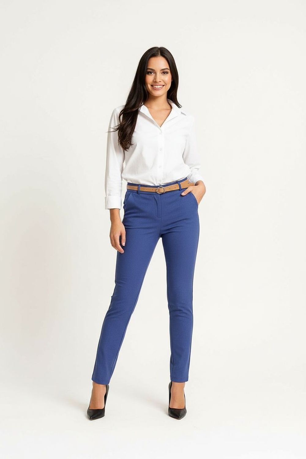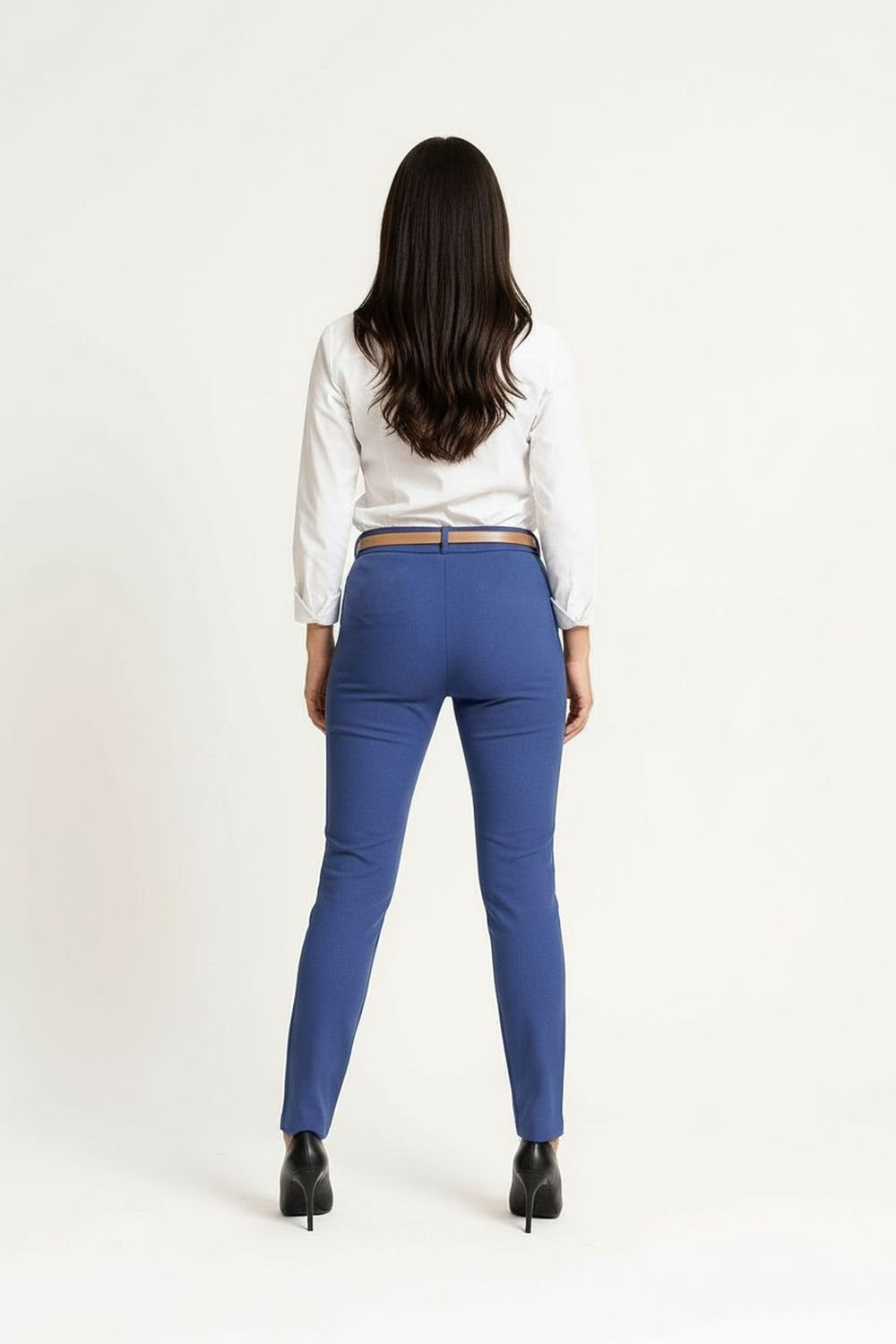 Pantalón de silueta ajustada, tiro medio, cierre frontal con botón, trabillas para cinturón, bolsillos laterales y traseros, corte estilizado que define la figura