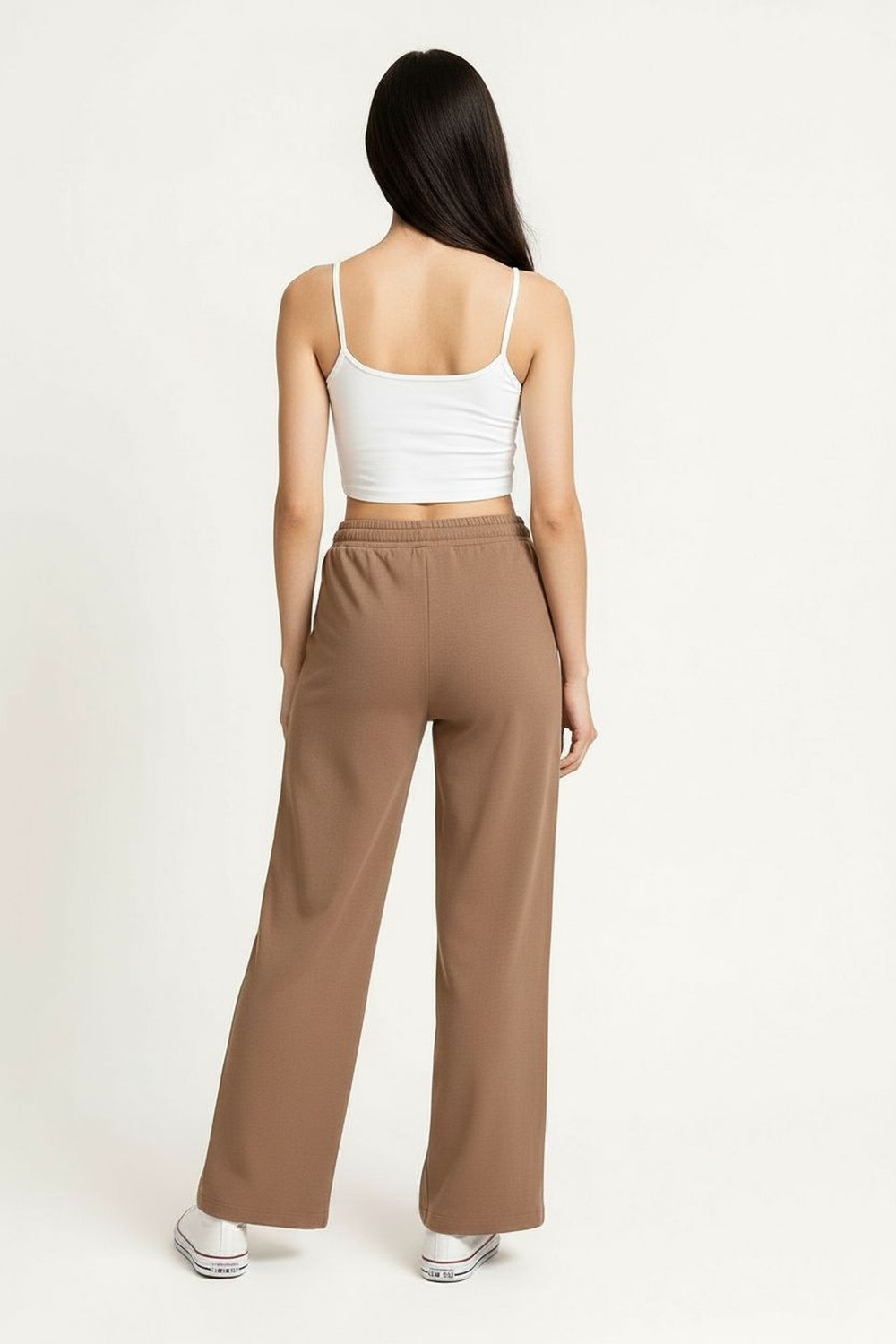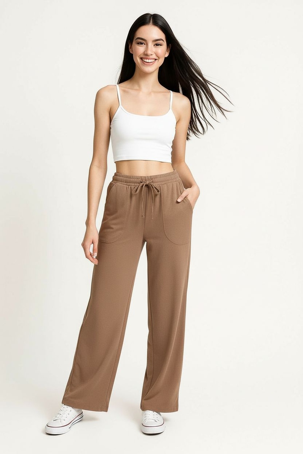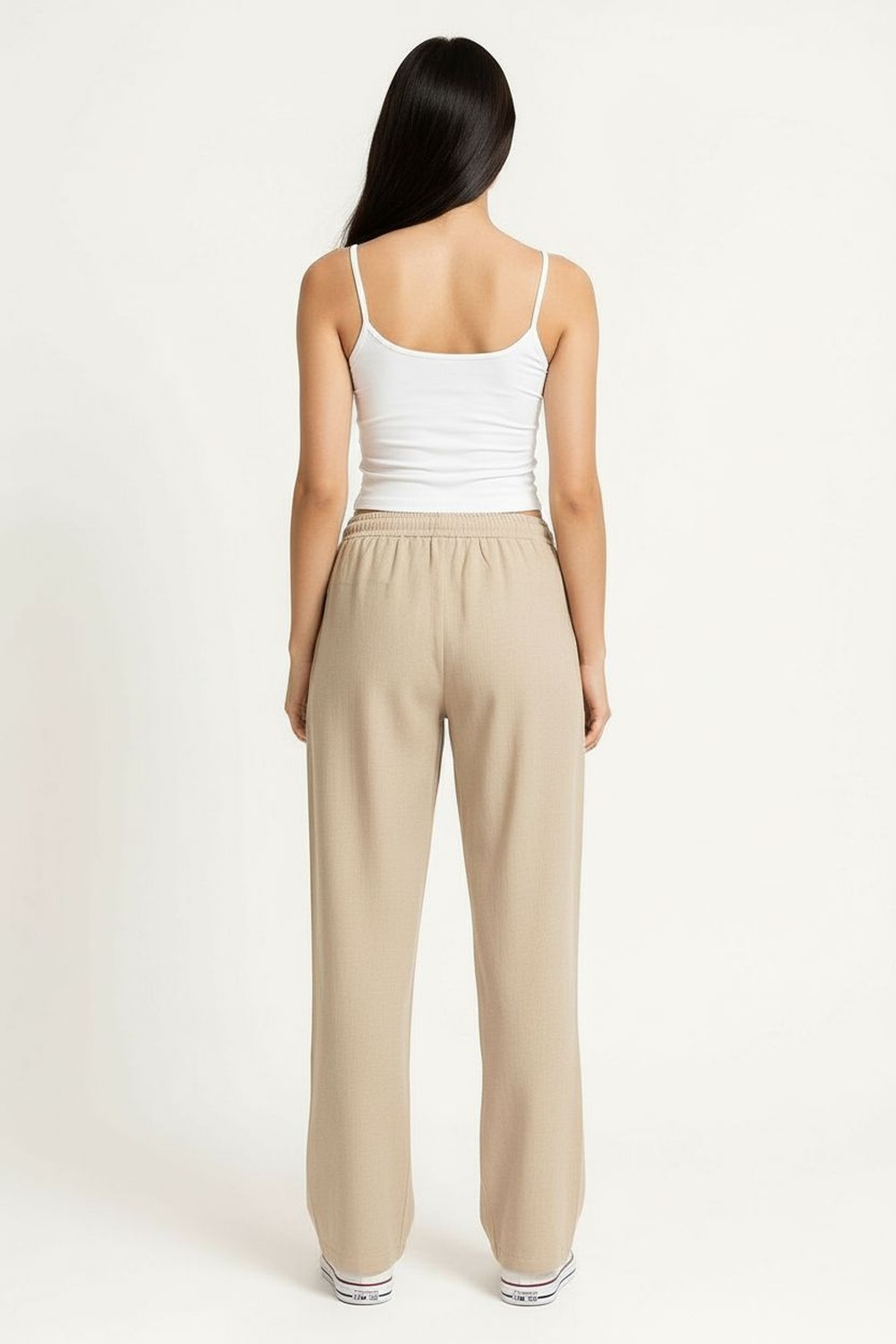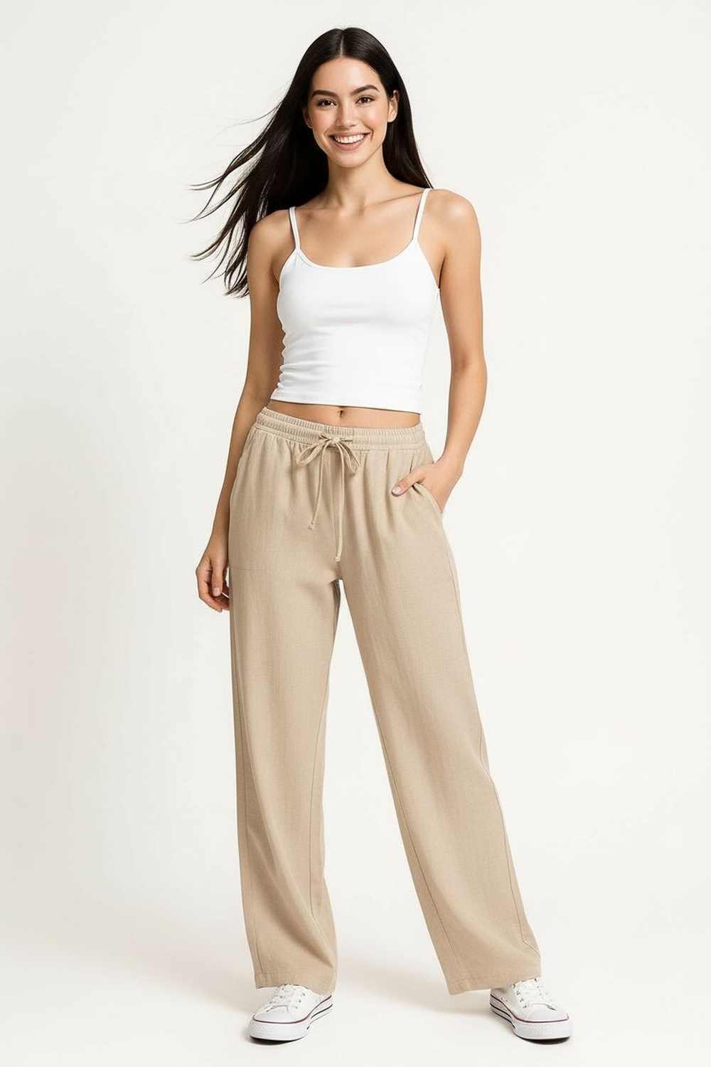 Pantalón de tiro medio con pretina elástica y jareta ajustable, corte amplio en pierna que permite movilidad, largo recto al tobillo con caída ligera, confección en tejido tipo lino de tacto fresco, acabado limpio con ajuste relajado
