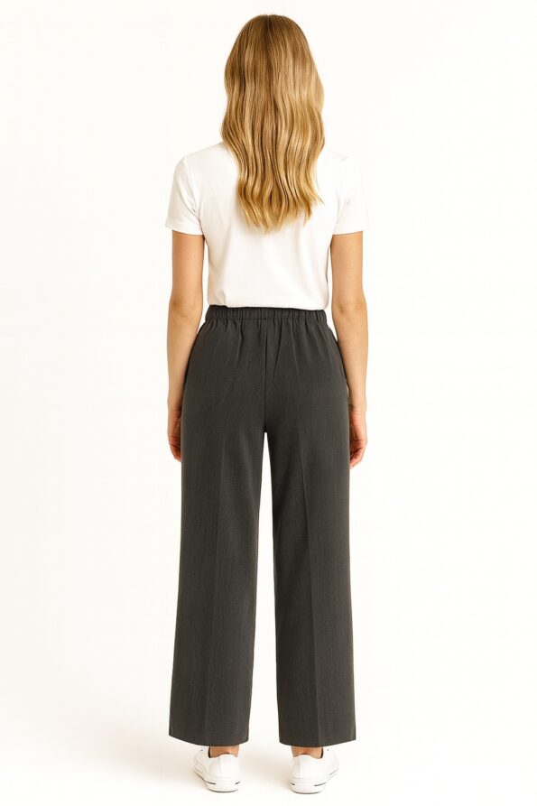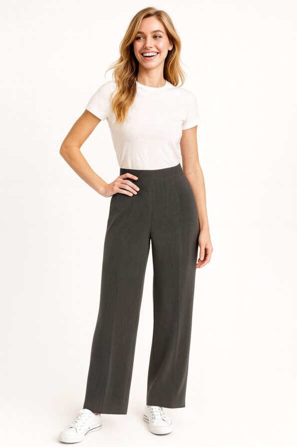 Pantalón de tiro alto con corte recto que brinda caída elegante y cómoda, confeccionado en tejido liso de tacto suave que aporta estructura, bolsas diagonales funcionales que ofrecen practicidad, pretina ancha que asegura un ajuste cómodo y favorecedor