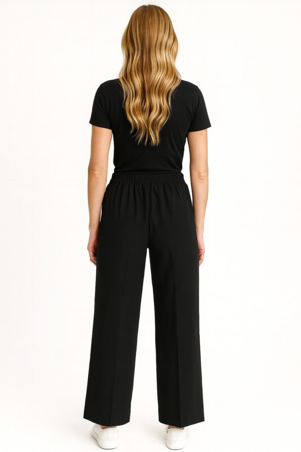 Pantalón negro liso es el epítome de la sofisticación minimalista, confeccionado en un tejido de tecno crépe de excelente caída, su silueta de corte acampanado estiliza la figura, talle alto define la cintura y aporta estructura, ideal para un elegante, pulido y moderno
