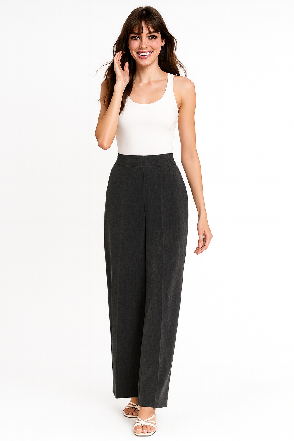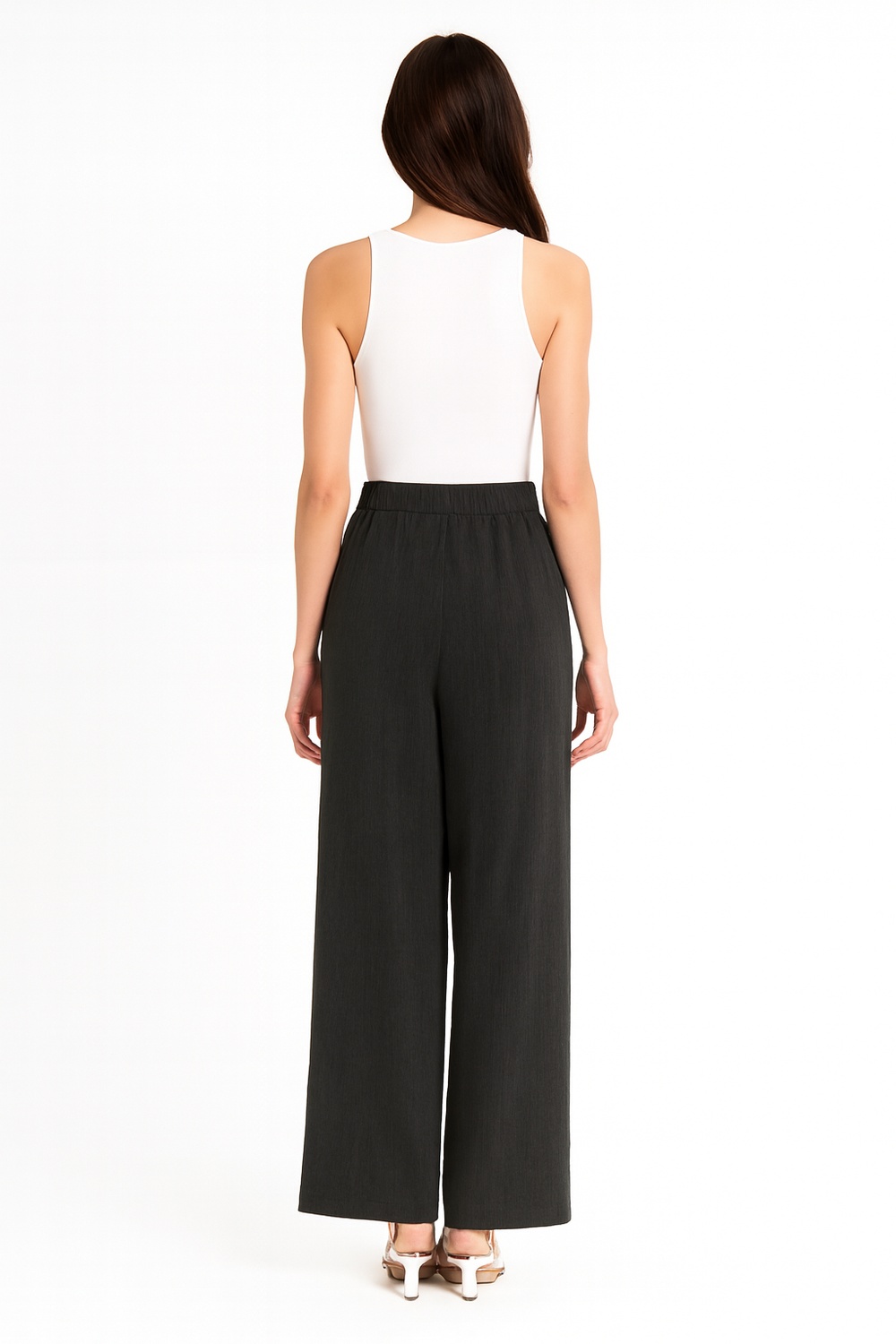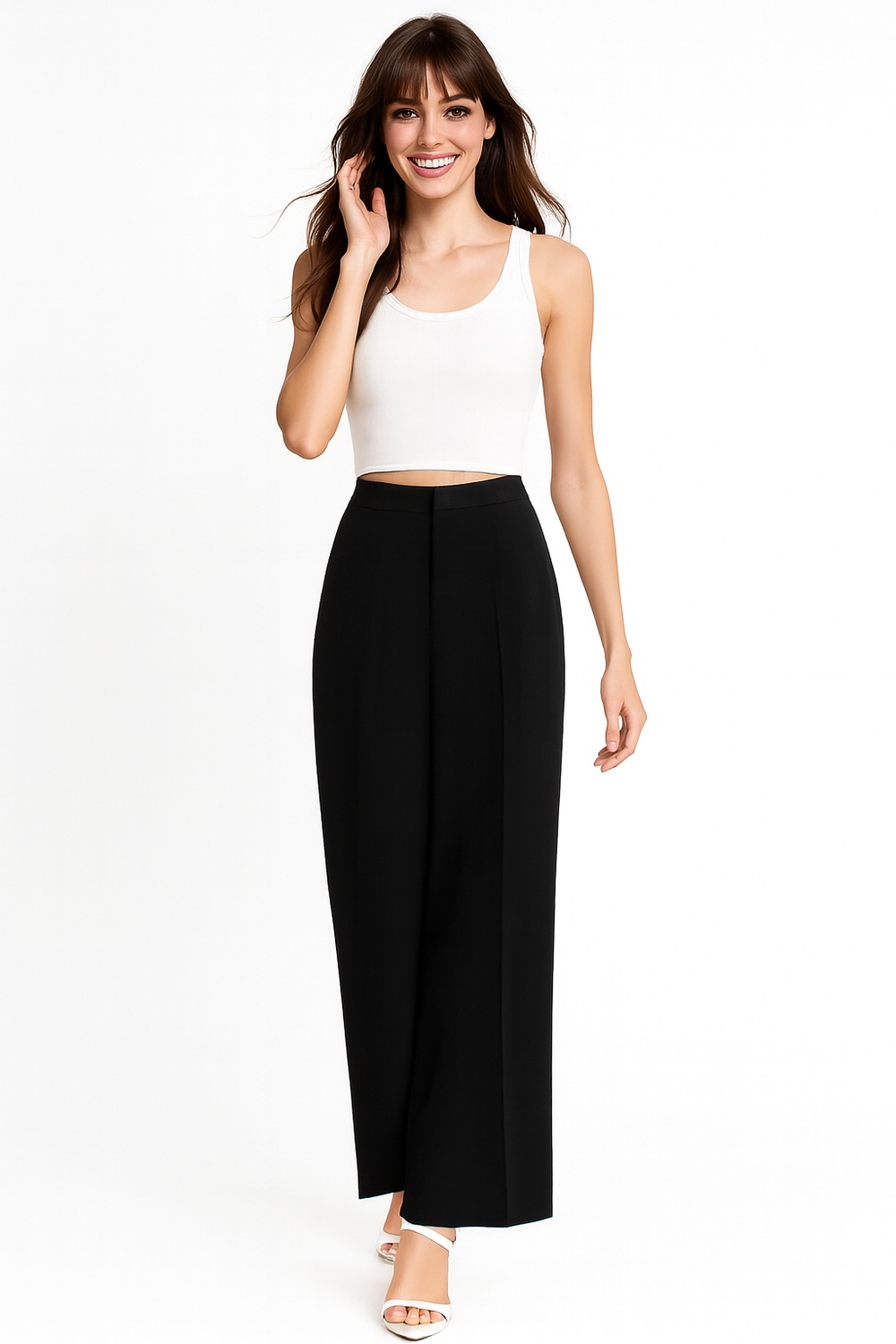 Pantalón de tiro alto con pretina lisa y ajuste estructurado, pierna recta de largo cropped, bolsillos diagonales funcionales al frente, confección en tejido firme que aporta caída limpia y comodidad