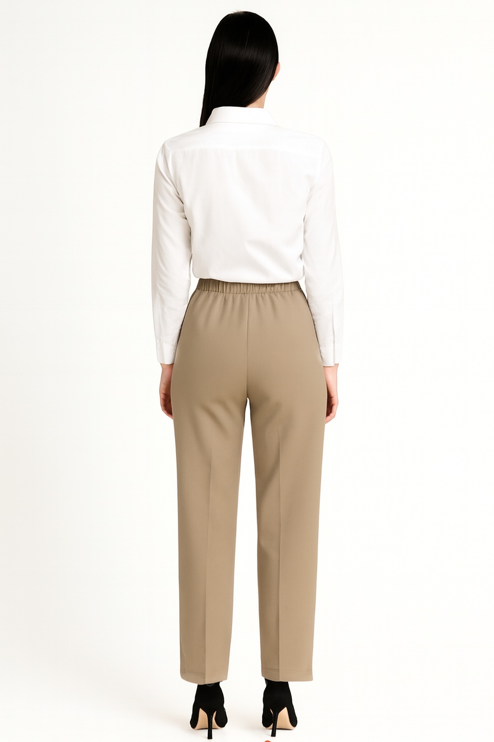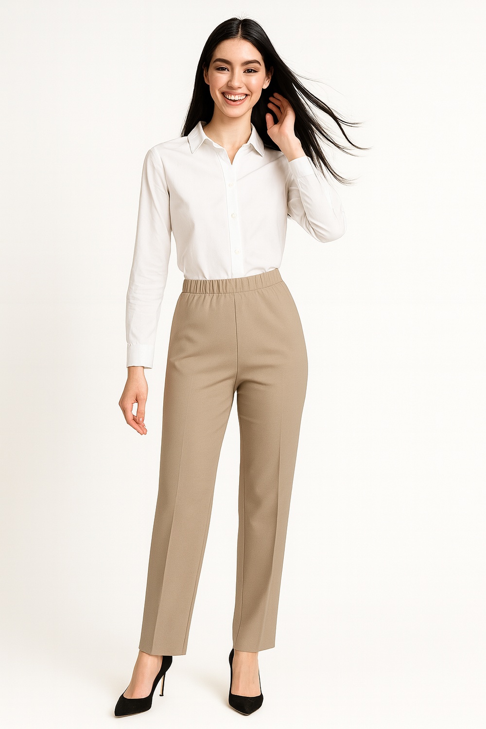Pantalón de tiro alto con doble botón frontal que brinda ajuste firme, pretina estructurada que define la cintura, pierna recta de largo completo que estiliza la silueta, bolsillos funcionales integrados al diseño, confección en tejido de tacto suave y estructura media