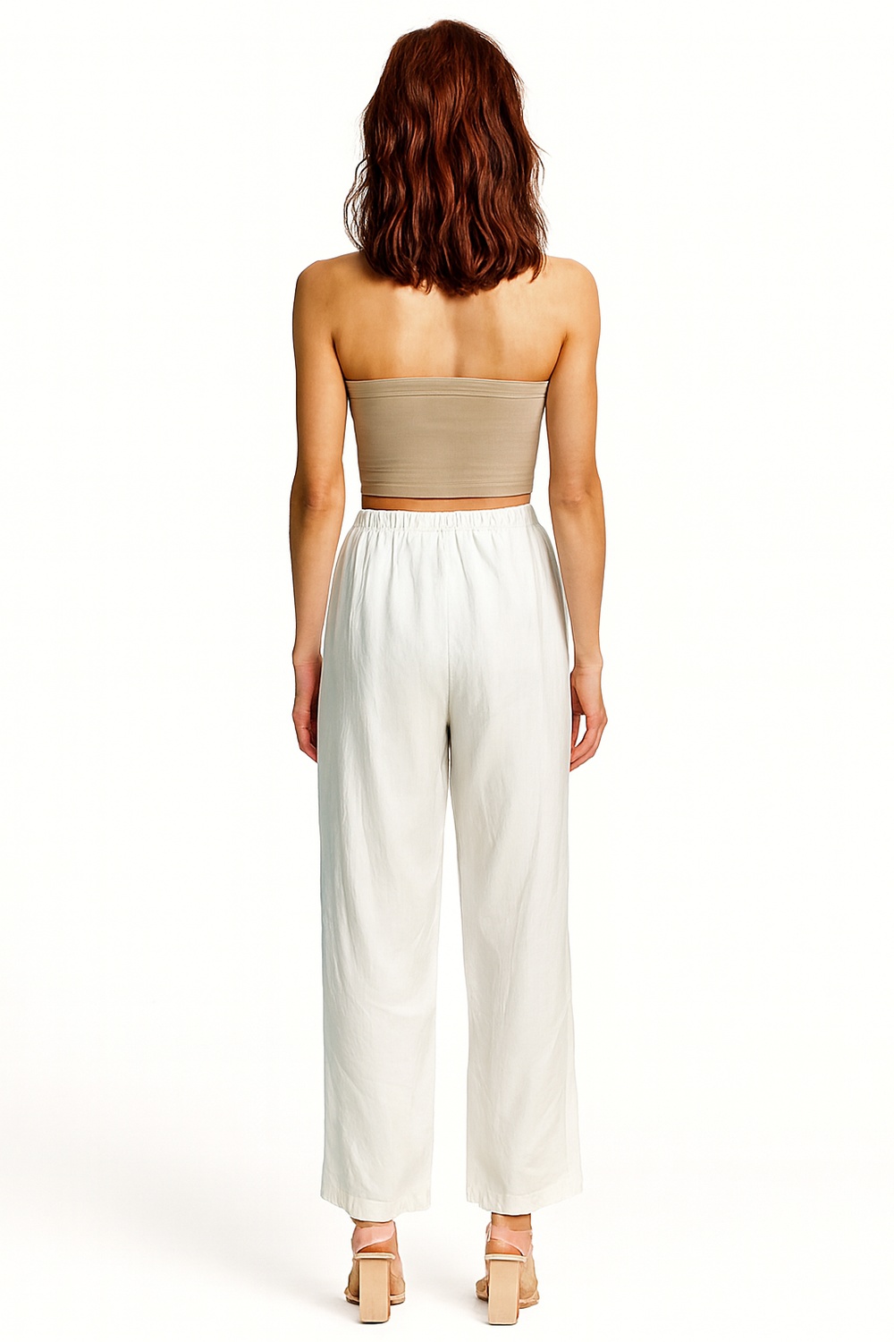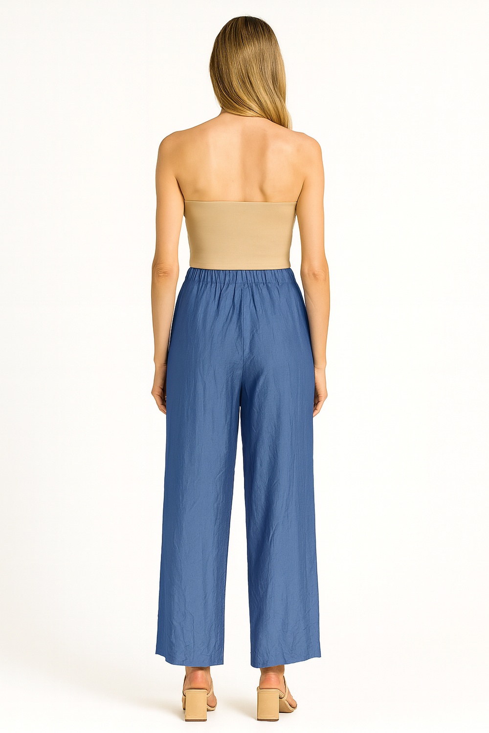 Capri de tiro alto con pretina lisa que proporciona ajuste firme en la cintura, corte amplio en pierna que aporta libertad de movimiento, largo debajo de la rodilla que estiliza la silueta, confección en tejido ligero de caída fluida que mejora la comodidad, terminaciones suaves que elevan la presentación de la prenda