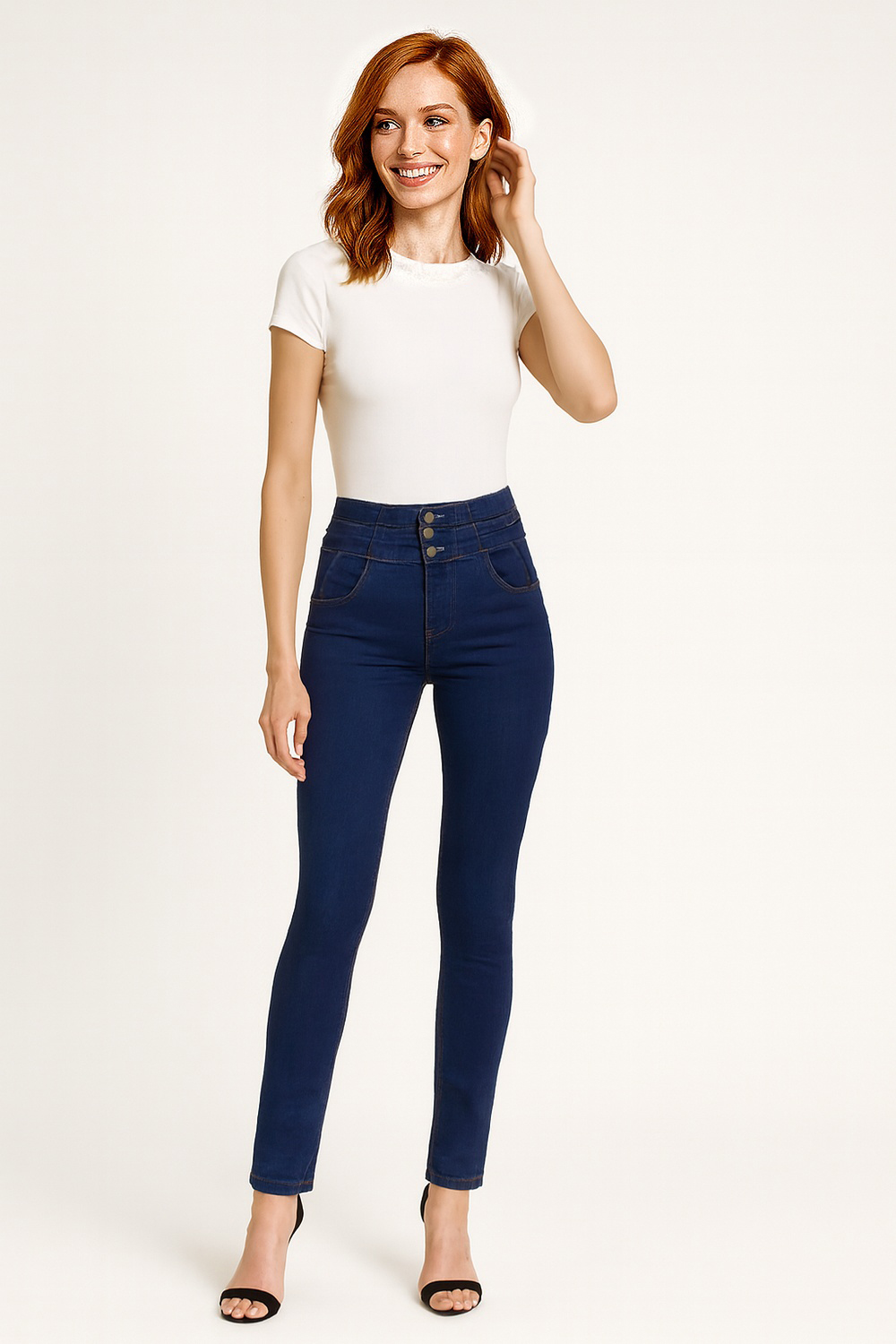 Pantalón de tiro medio con pretina ancha y botonadura frontal visible que define la cintura, corte pitillo ajustado desde cadera hasta tobillo que estiliza la silueta, diseño con bolsas traseras funcionales que aportan estructura, confección en mezclilla stretch que brinda comodidad y libertad de movimiento, acabado limpio en bajo con ajuste ceñido