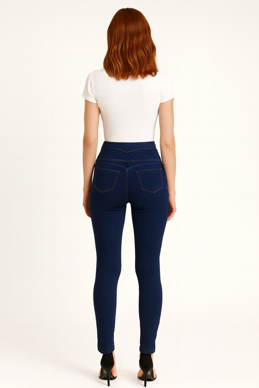 Jeans de corte skinny con tiro alto que realza la figura, bolsillos traseros funcionales que estilizan y aportan practicidad, corte ajustado que moldea y brinda un look moderno, mezclilla elástica que asegura comodidad y libertad de movimiento, perfecto para outfits casuales y versátiles de temporada