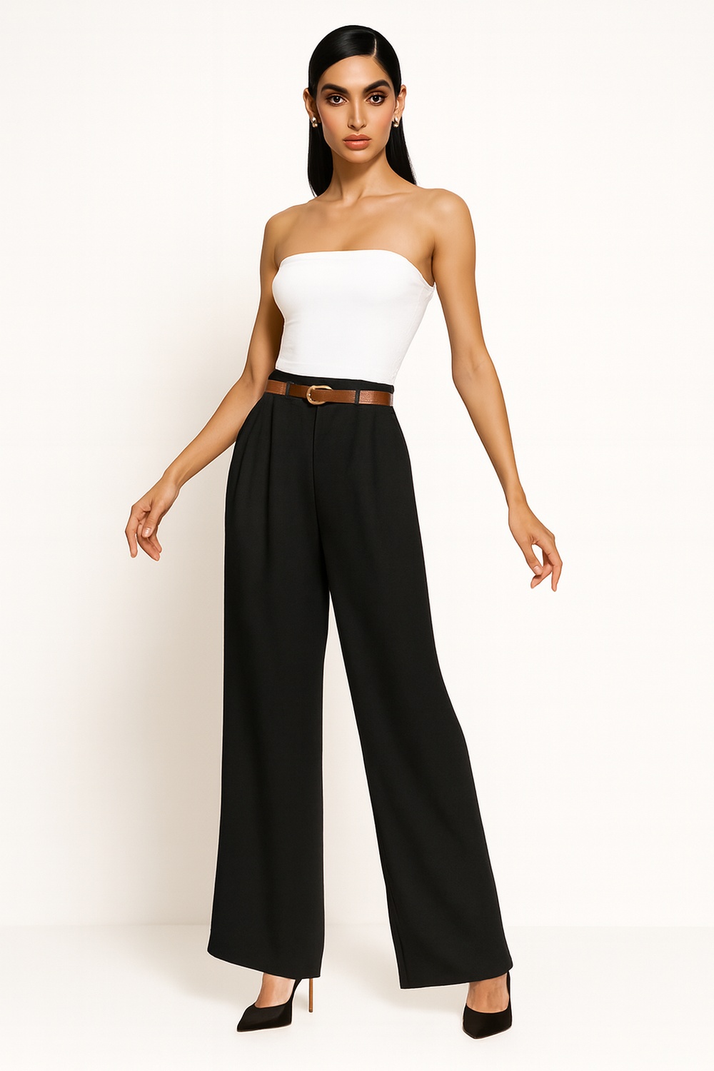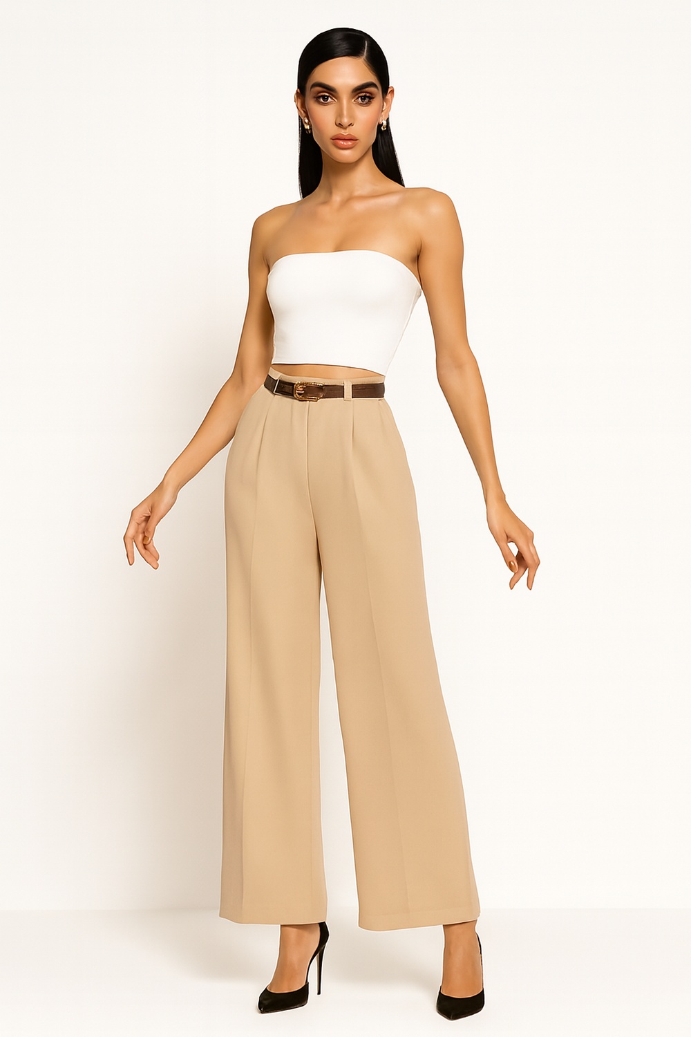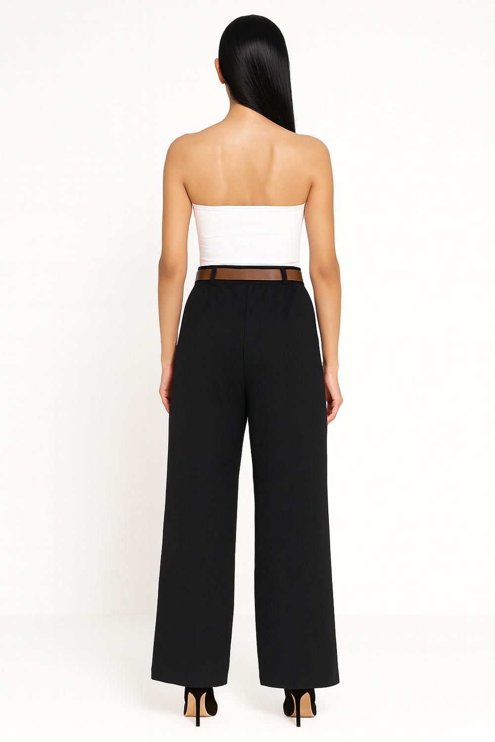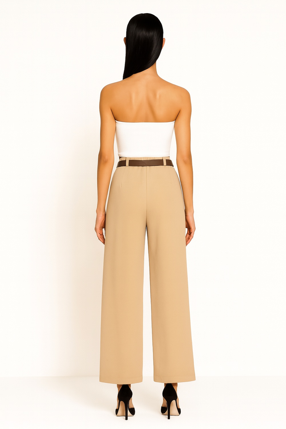 Pantalón de corte recto con pretina alta y trabas para cinturón incluido, diseño de pierna amplia con caída uniforme desde cadera, estructura firme que mantiene la forma, largo completo con terminación limpia en bajo, confección suave que brinda comodidad y ajuste práctico