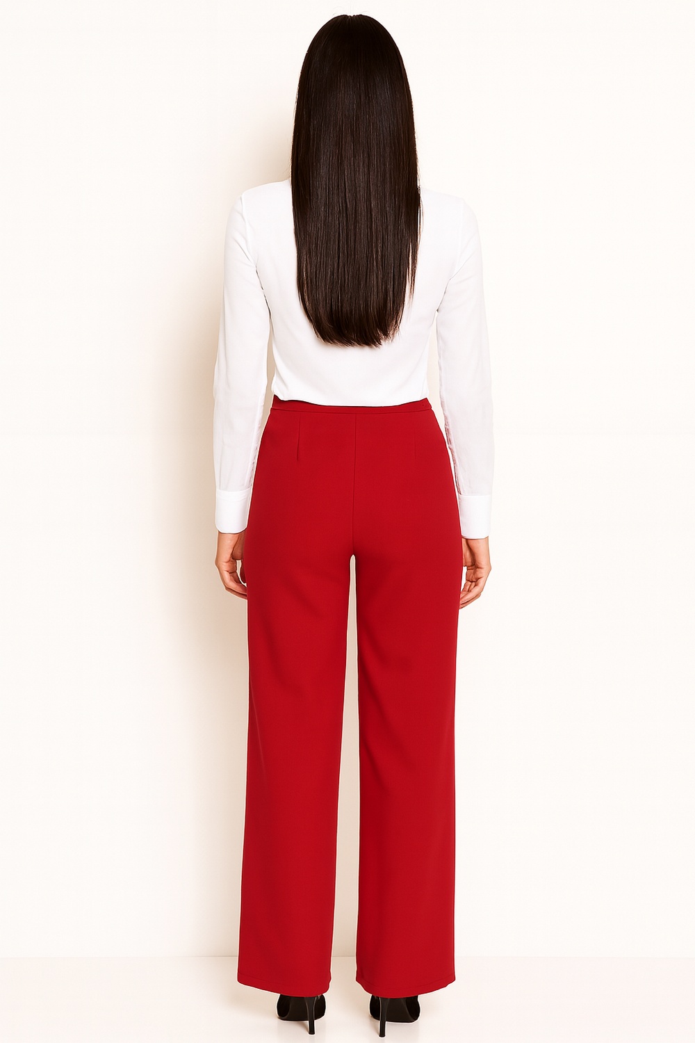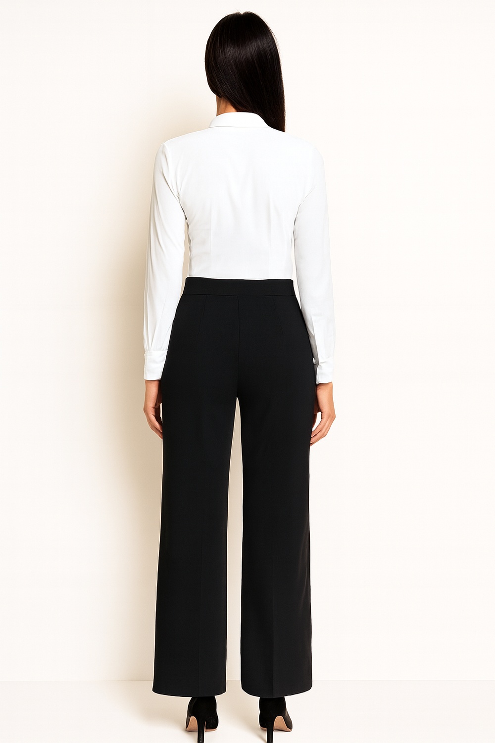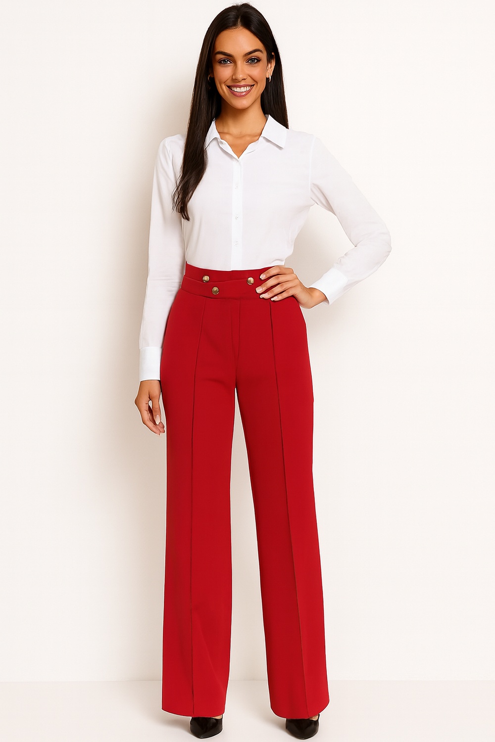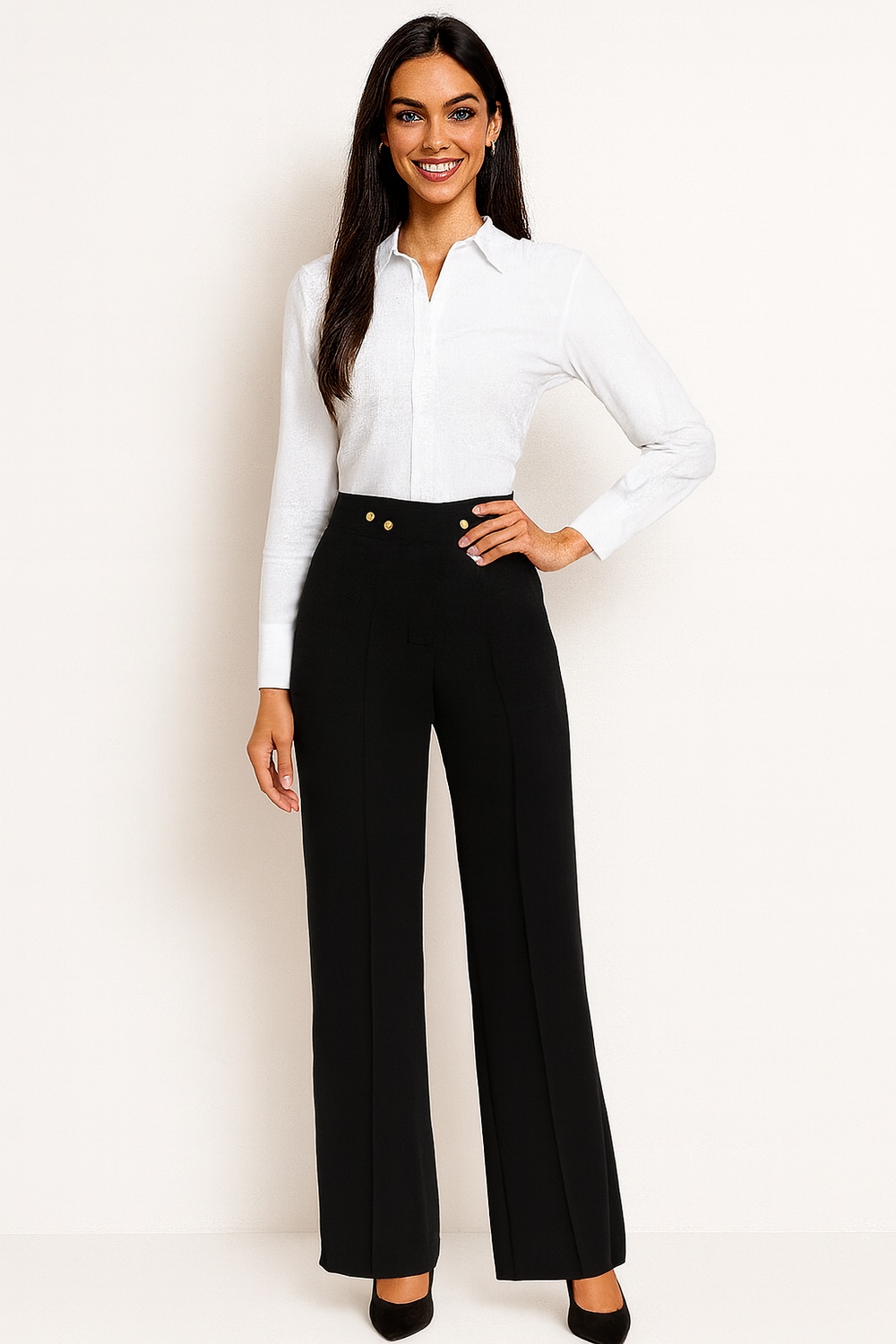 Pantalón de tiro alto con pretina ancha estructurada con botones metálicos al frente que aportan firmeza al ajuste, corte recto que permite caída fluida en la pierna, pinzas frontales que mejoran la forma en la zona superior, acabado limpio en dobladillo para una apariencia más pulida, fabricado en tejido suave con ligera elasticidad que brinda comodidad durante el movimiento