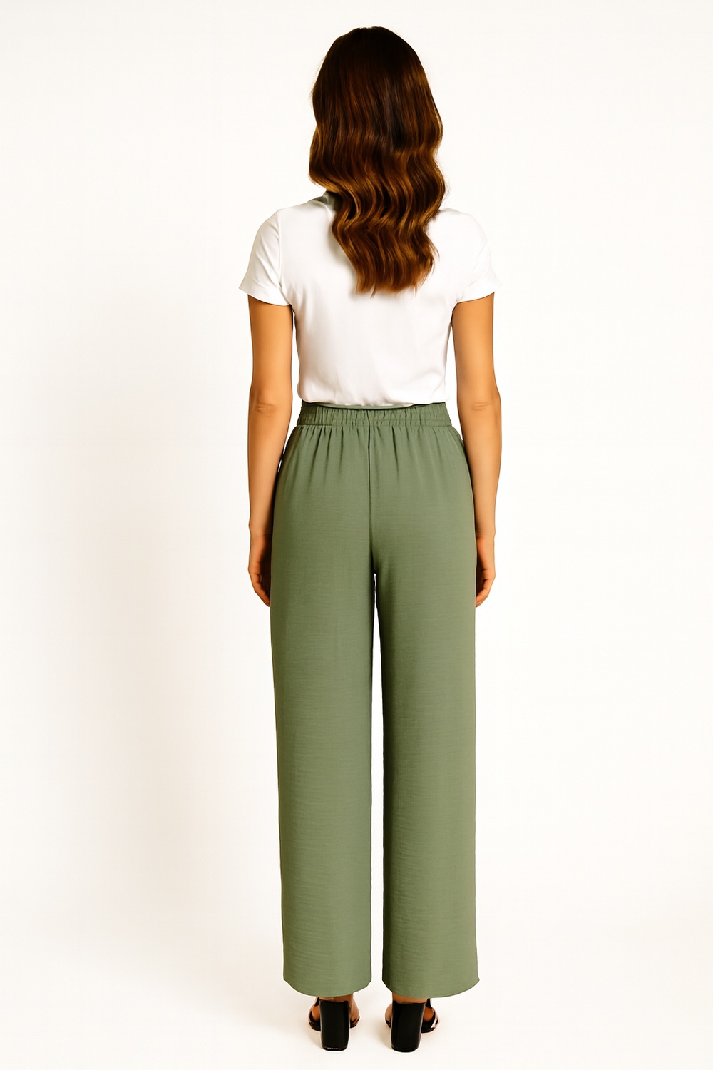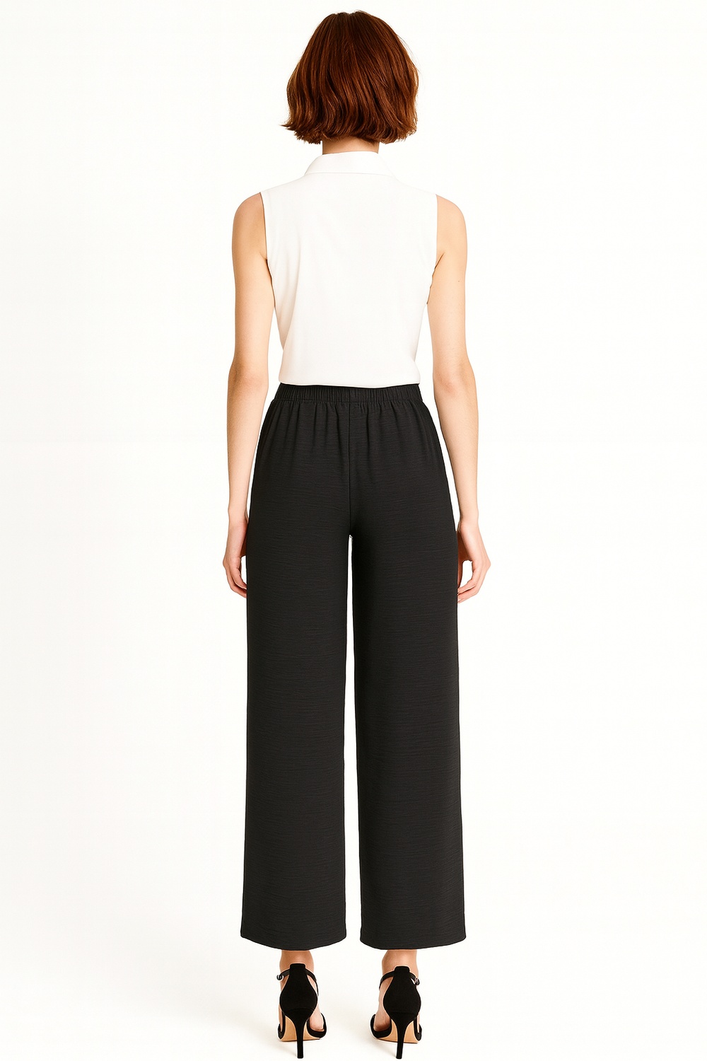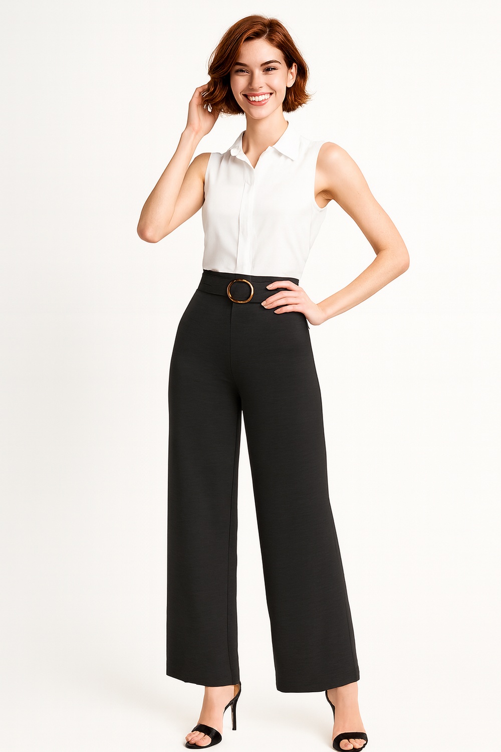 Pantalón de tiro medio con pretina estructurada y cinturón integrado con aro decorativo, silueta recta con ajuste cómodo en cadera, largo cropped que equilibra proporciones, confección en tejido con cuerpo ligero que mantiene la forma, diseño funcional que aporta soporte y comodidad al vestir