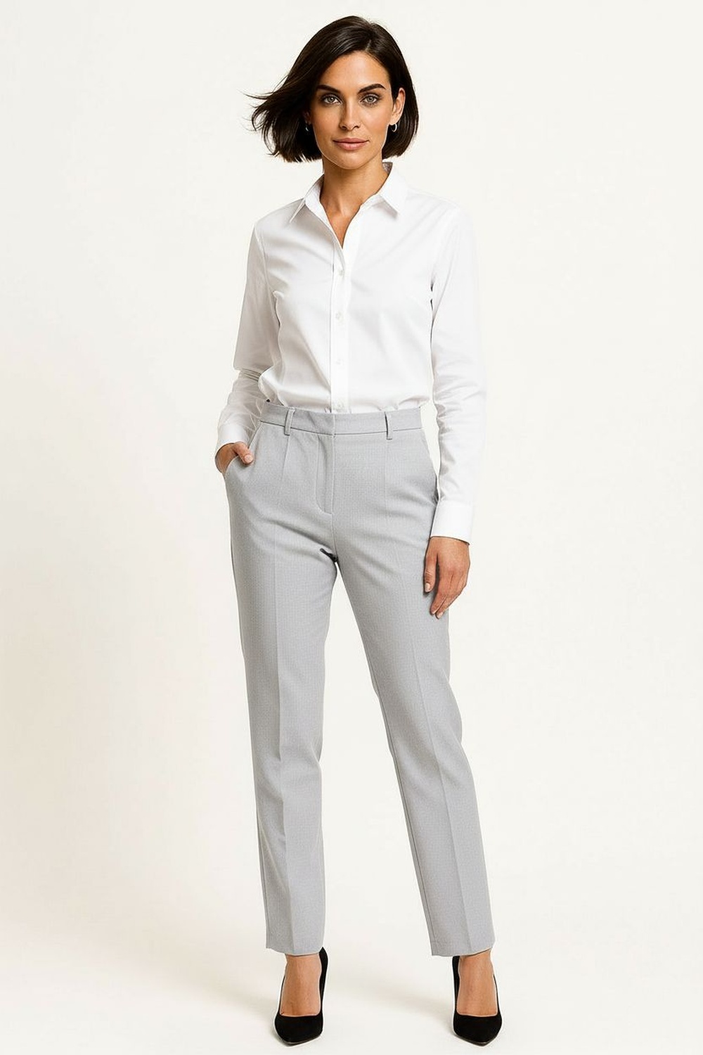 Pantalón de corte recto en tela estructurada con cierre frontal y broche metálico, pretina con trabillas para cinturón que ofrecen ajuste seguro, bolsas laterales funcionales para uso cotidiano, caída fluida con apariencia pulida