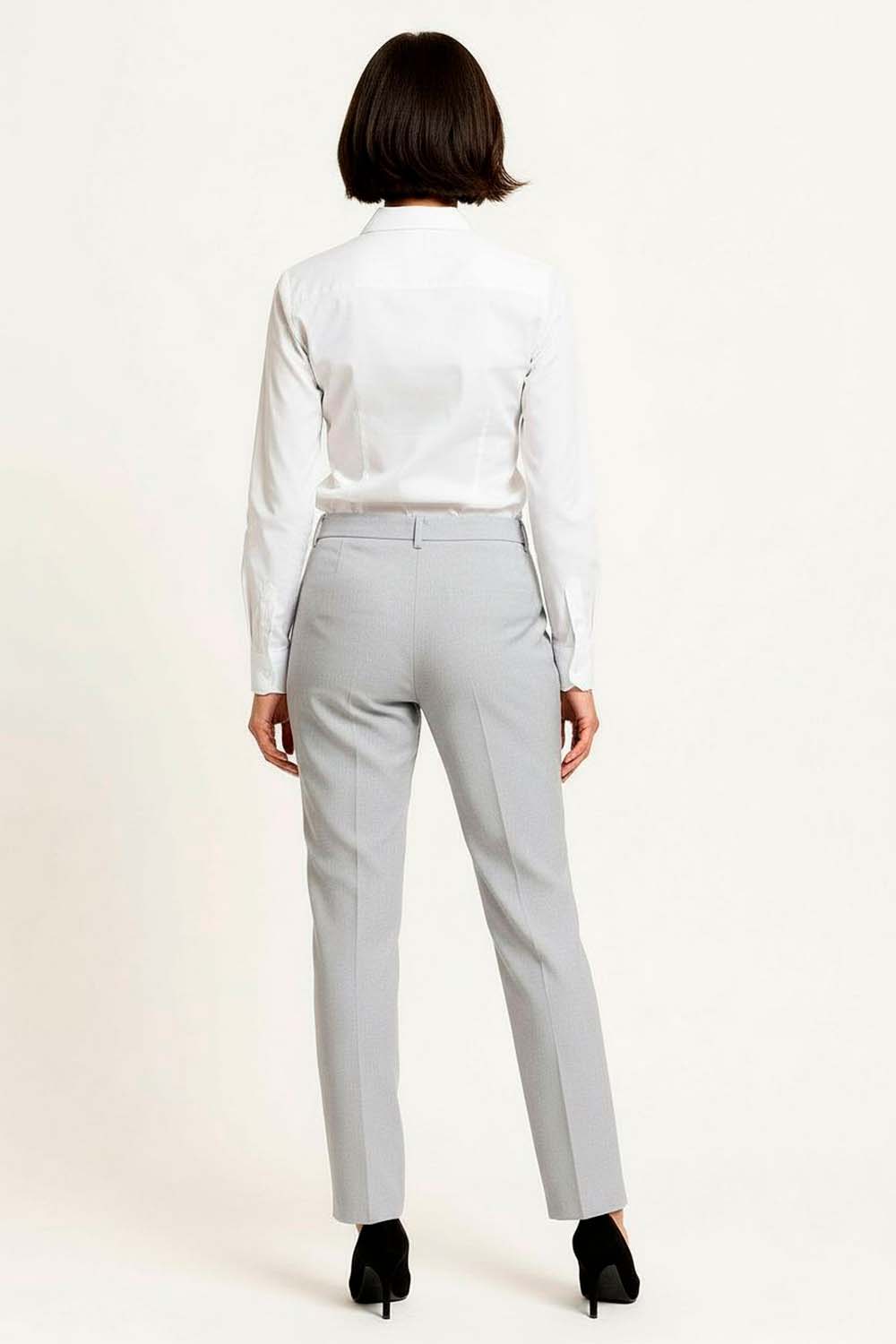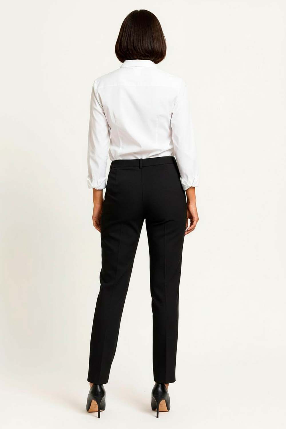 Pantalón de tiro medio con silueta recta que estiliza la figura, diseño con bolsillos funcionales y detalle metálico decorativo en pretina que aporta estructura al ajuste, confección en tejido resistente de caída limpia que mantiene la forma, pretina firme que brinda soporte y comodidad durante todo el día