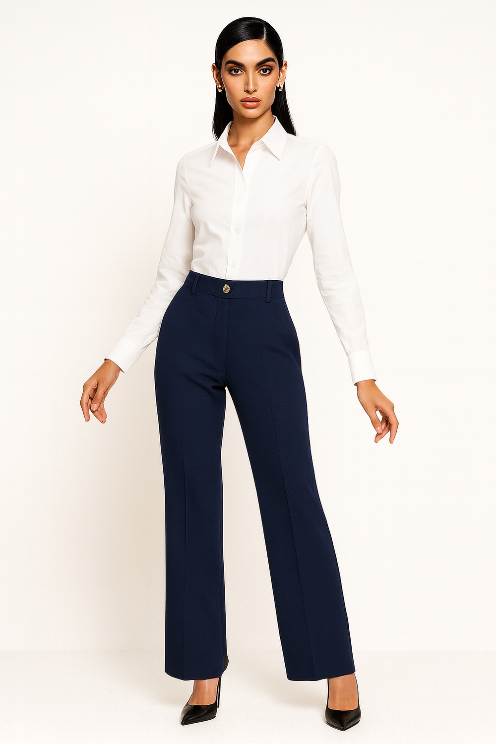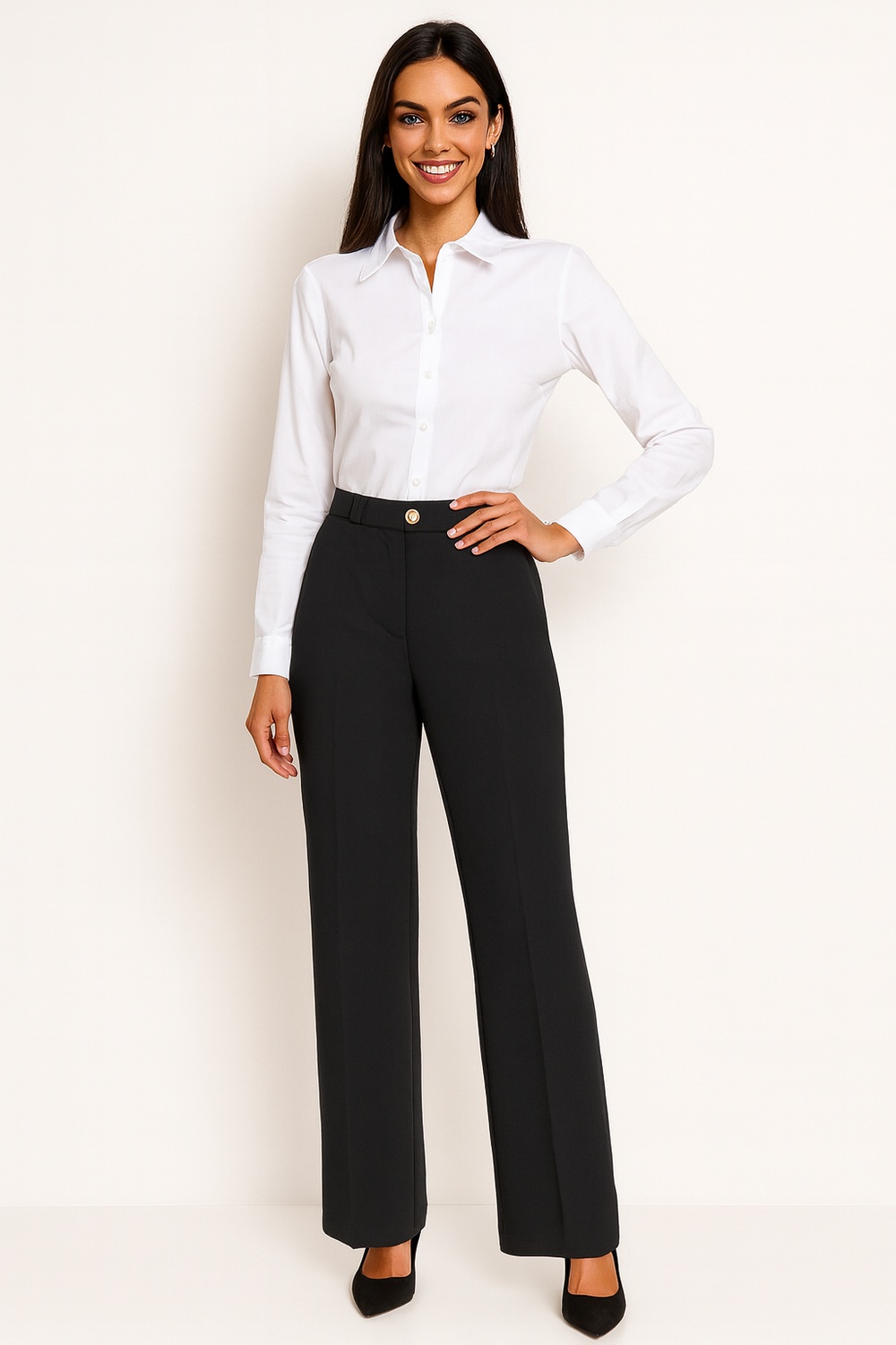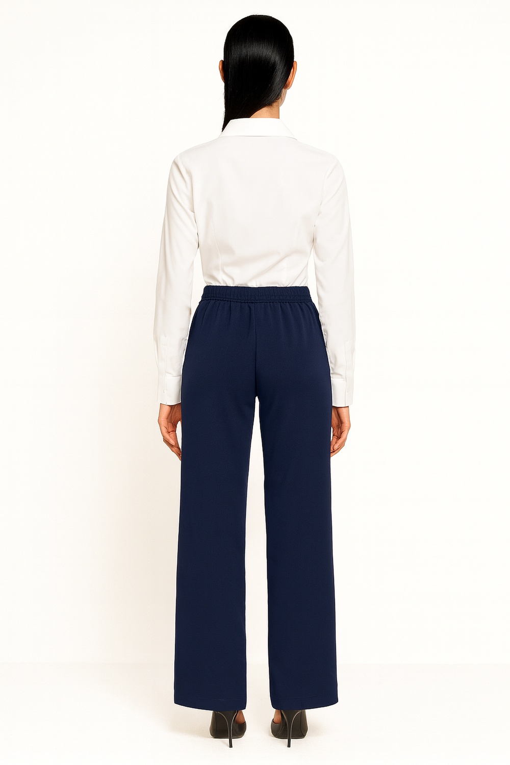 Pantalón de corte recto con pretina fija y resorte posterior que mejora el ajuste, tiro medio con estructura definida, bolsillos laterales funcionales integrados al diseño, confección en tejido firme con acabado pulido