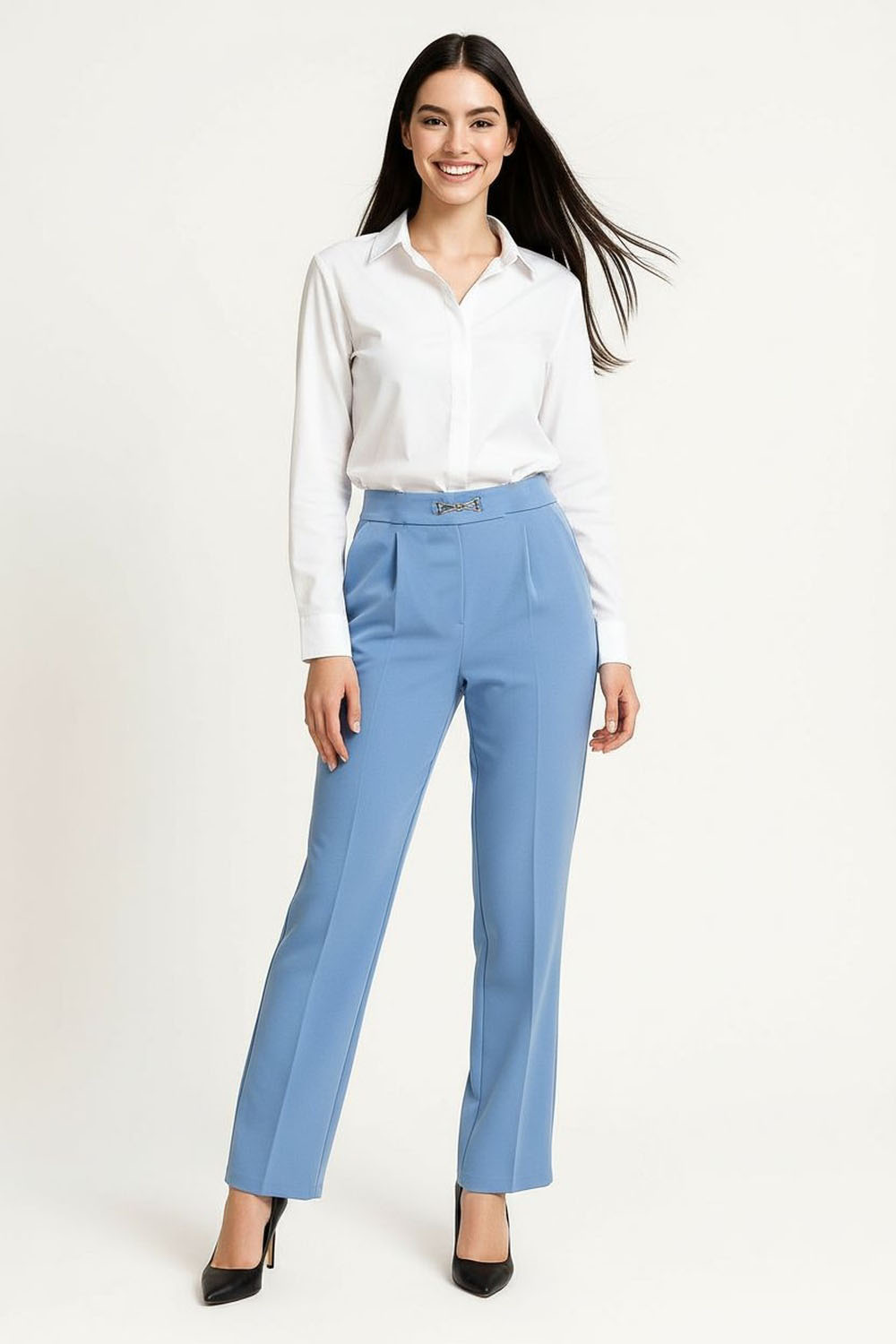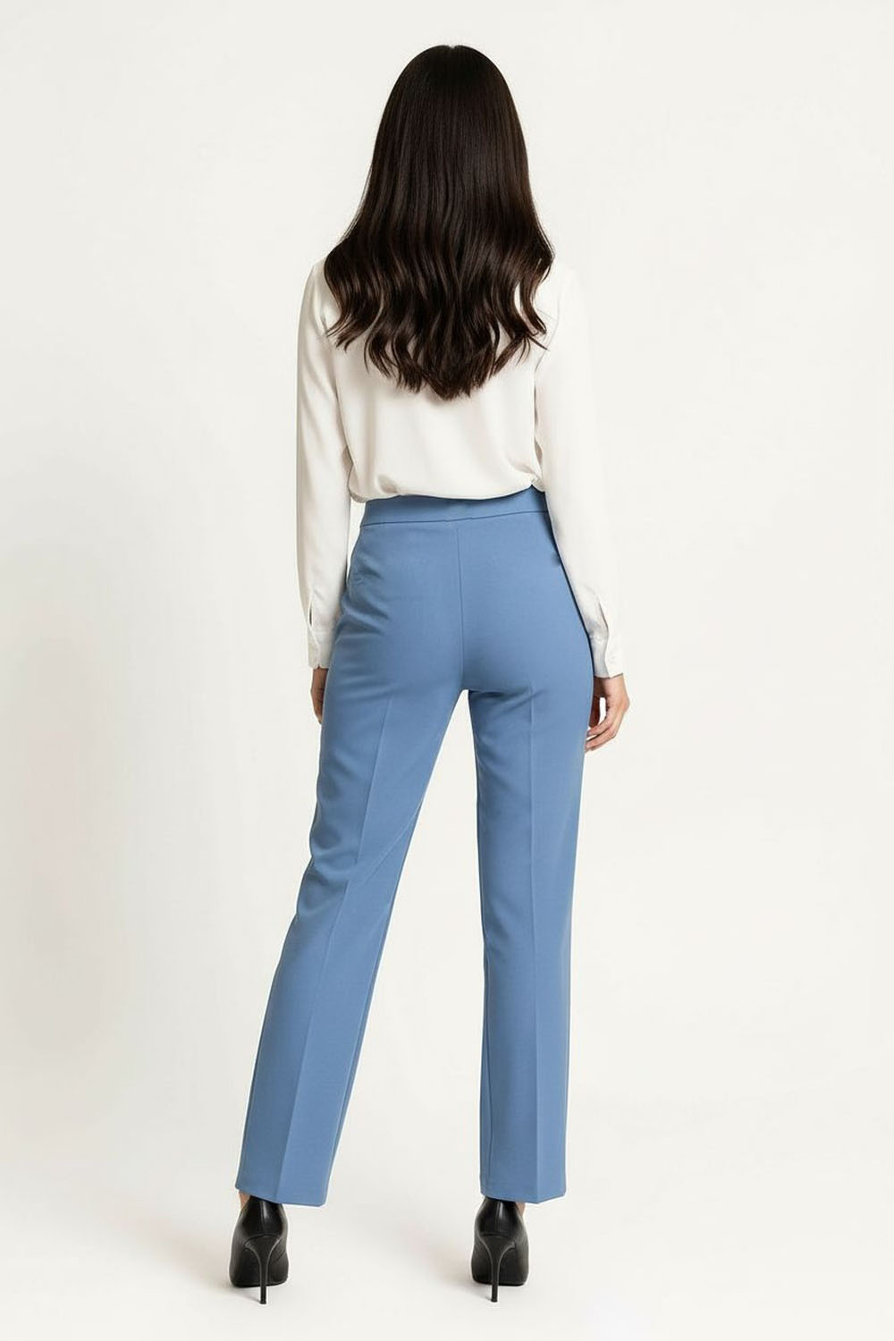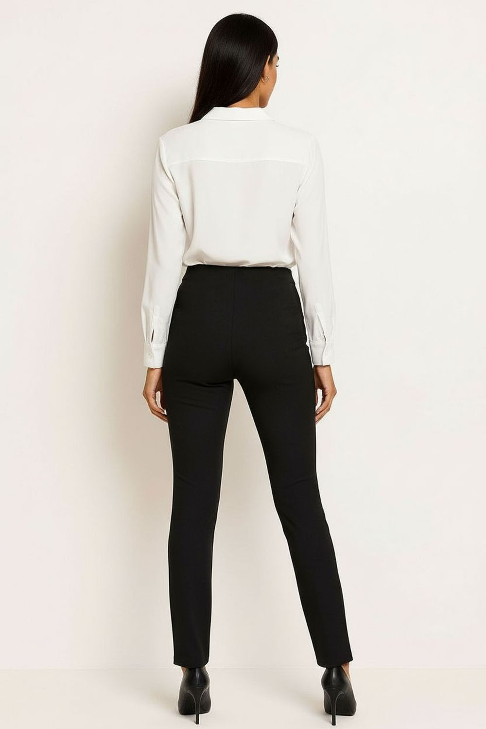 Pantalon recto, pretina estructurada con detalle decorativo frontal, costuras verticales, estructura firme, caída recta
