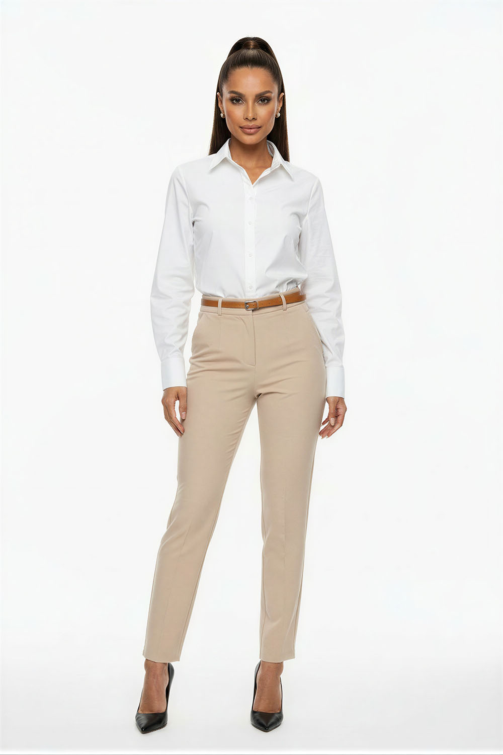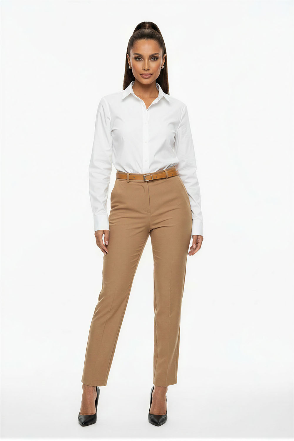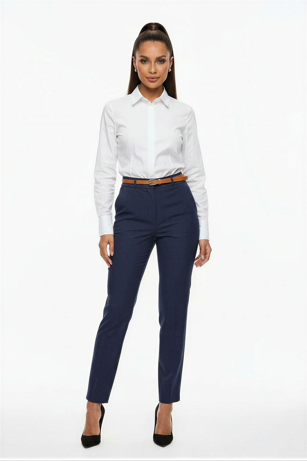 Pantalón de corte recto con diseño limpio que define la silueta, pretina alta con cinturón integrado que permite ajuste seguro, confección en tejido estructurado con caída uniforme que aporta presencia, largo al tobillo que favorece la proporción del cuerpo, detalle en cintura que añade un acabado distintivo