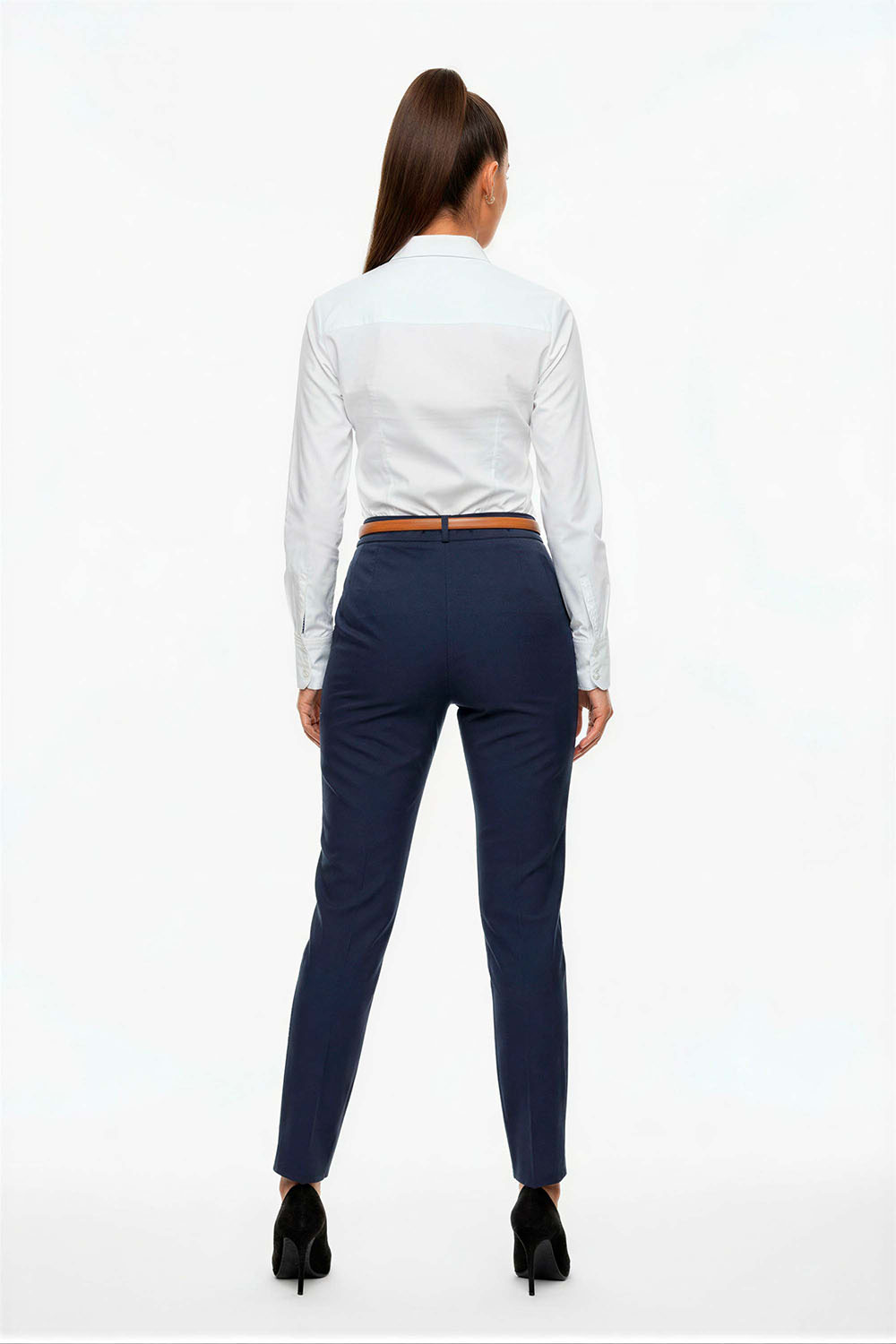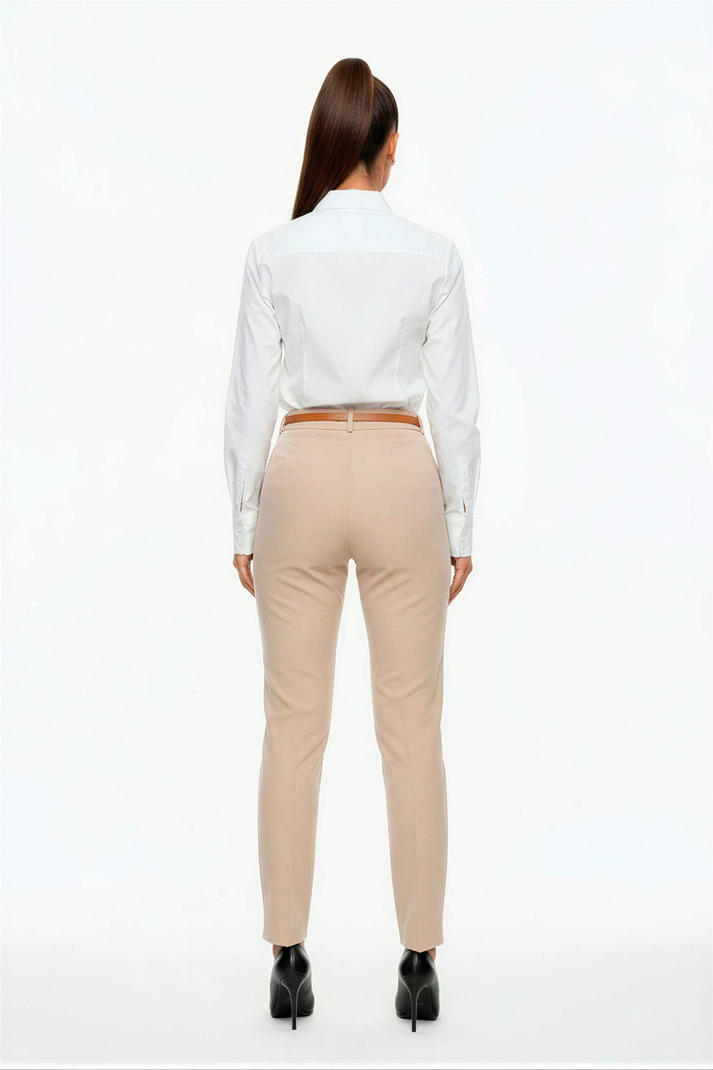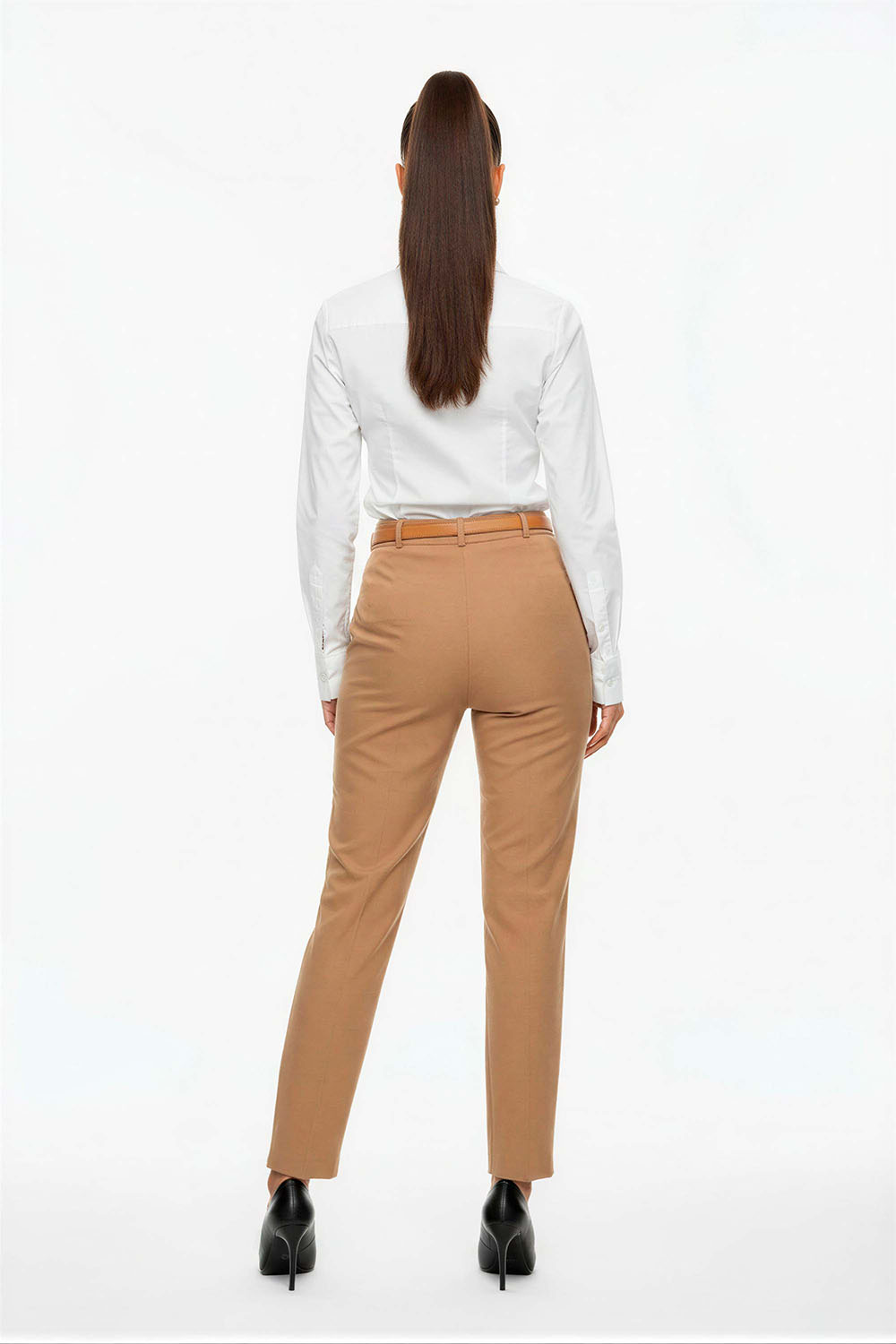 Pantalón de corte recto con diseño limpio que define la silueta, pretina alta con cinturón integrado que permite ajuste seguro, confección en tejido estructurado con caída uniforme que aporta presencia, largo al tobillo que favorece la proporción del cuerpo, detalle en cintura que añade un acabado distintivo