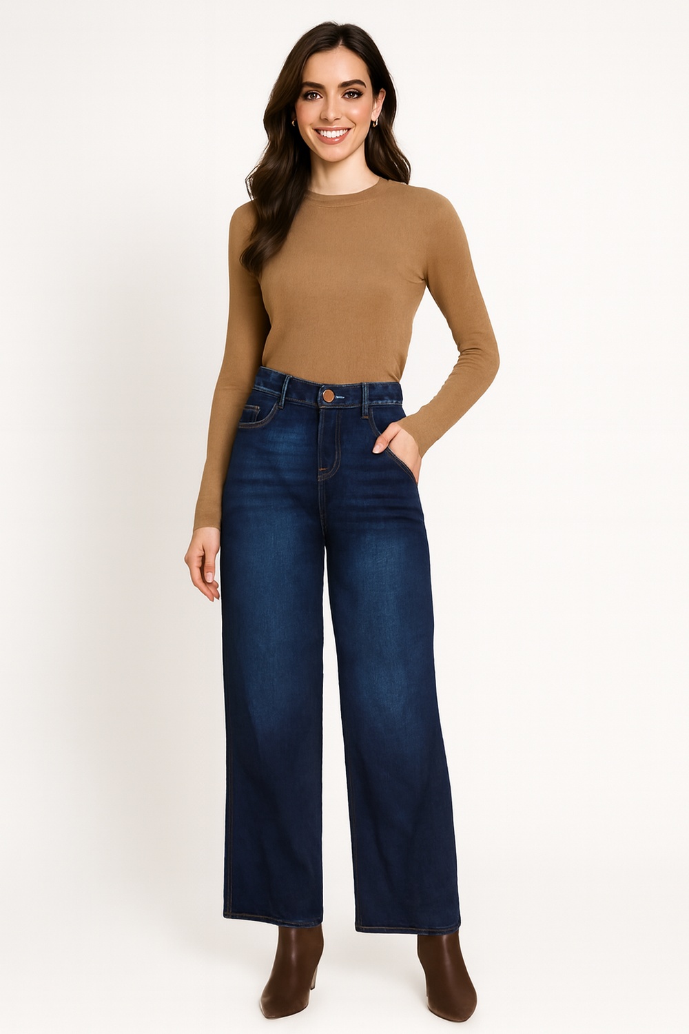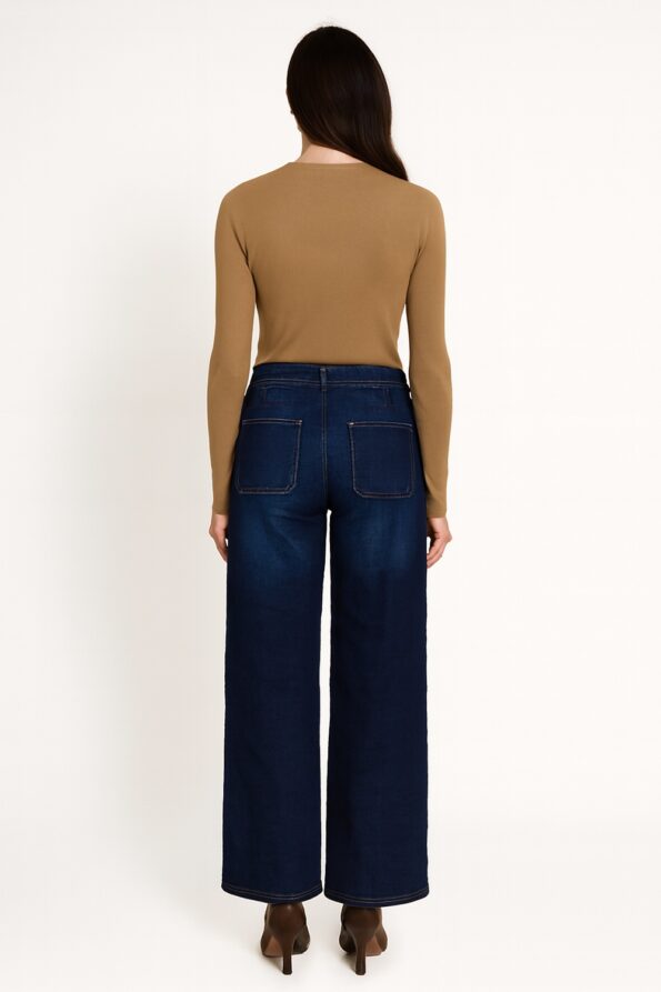 Pantalón de corte acampanado que estiliza la silueta y aporta un look moderno, talle alto con pretina ancha que asegura un ajuste firme y favorecedor, bolsillos delanteros y traseros funcionales que brindan practicidad, confección en mezclilla flexible que otorga comodidad y resistencia, dobladillo limpio que refuerza la estructura y mantiene la forma definida en cada uso