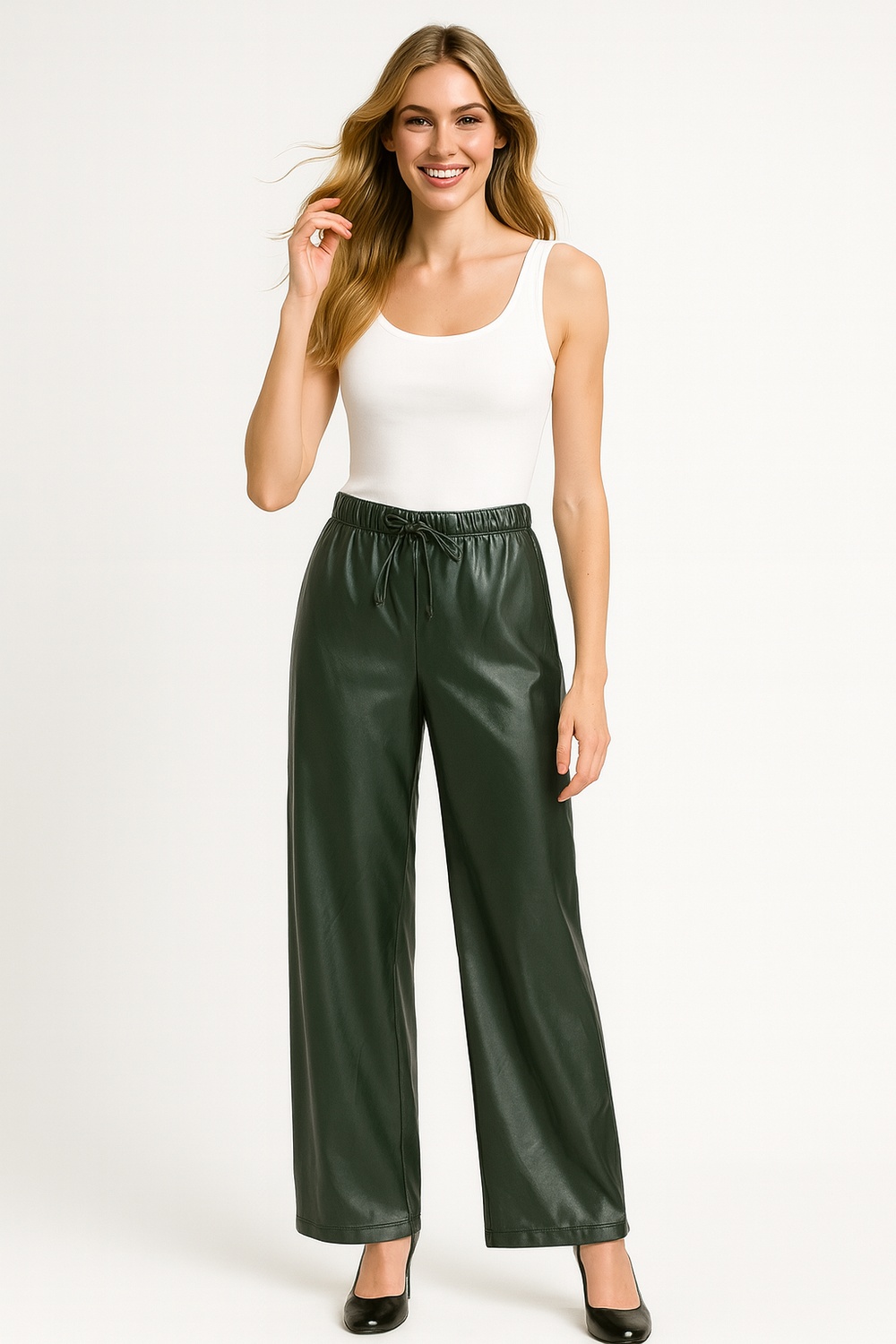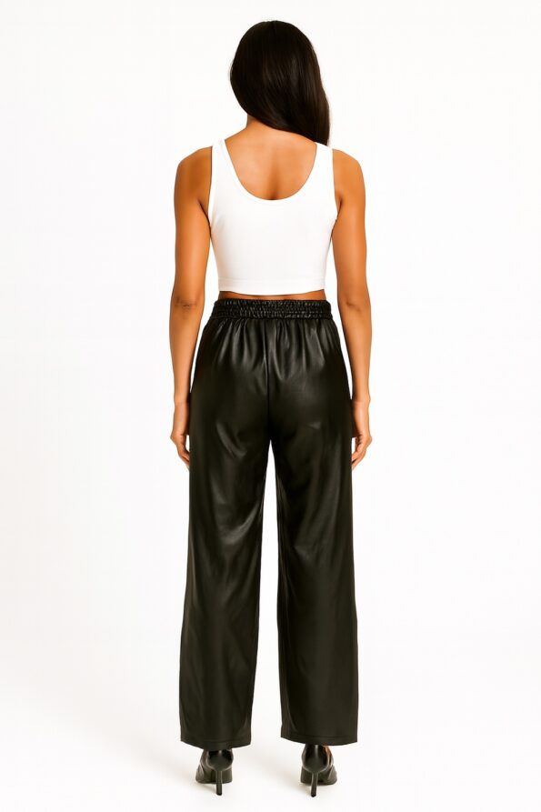 Pantalón de corte amplio con pretina elástica posterior que brinda comodidad, cinta delantera para anudar que permite un ajuste personalizado, confección en tejido ligero con caída fluida que favorece la movilidad, largo completo que estiliza la silueta y terminados prolijos que aportan un acabado moderno y versátil