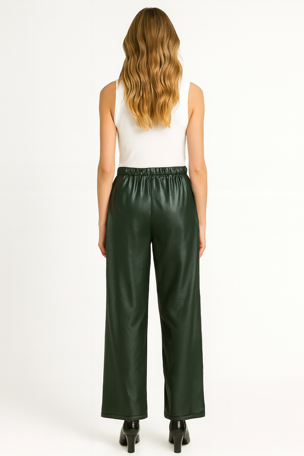 Pantalón de corte recto con pretina ancha y cierre frontal con doble botón metálico, diseño de tiro medio que ofrece ajuste cómodo, pinzas posteriores que moldean la figura, bolsas laterales funcionales y confección en tejido estructurado con textura suave que aporta un acabado elegante y moderno, ideal para looks casuales o de oficina