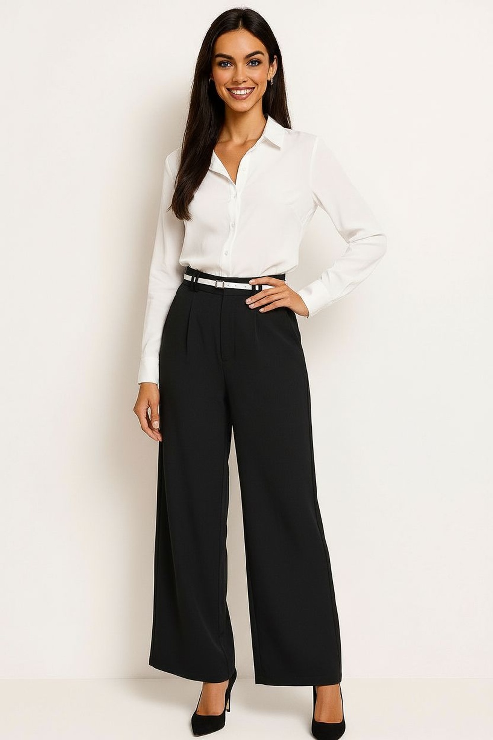 Pantalón amplio de tiro medio con pinzas frontales que aportan mejor ajuste en cintura, pretina estructurada con doble botón decorativo que refuerza la firmeza al cerrar, pierna recta de caída amplia que estiliza visualmente, largo completo que alarga la silueta, confección en tela de textura suave con excelente caída y comodidad durante todo el día