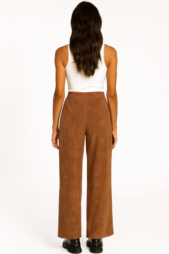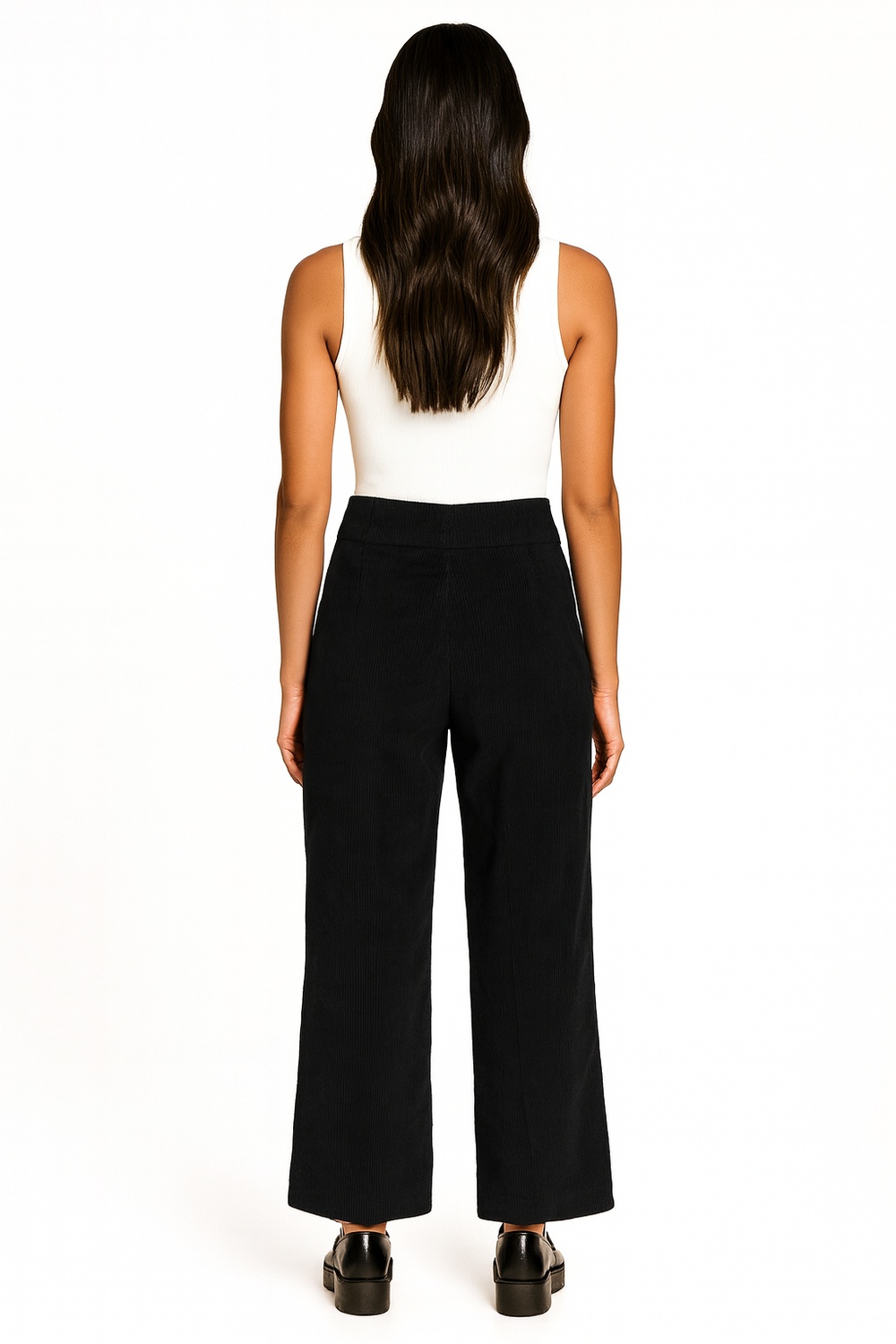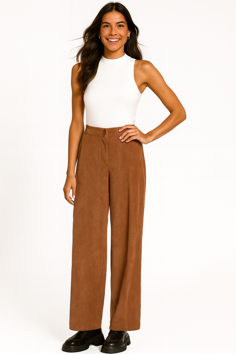 Pantalón de corte recto con pretina ancha y cierre frontal con doble botón metálico, diseño de tiro medio que ofrece ajuste cómodo, pinzas posteriores que moldean la figura, bolsas laterales funcionales y confección en tejido estructurado con textura suave que aporta un acabado elegante y moderno, ideal para looks casuales o de oficina