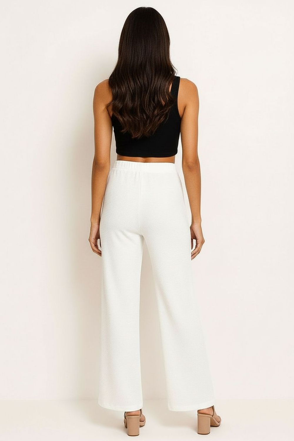 Pantalón de corte recto, pretina elástica, estructura ligera con forro interior, caída uniforme, terminación recta