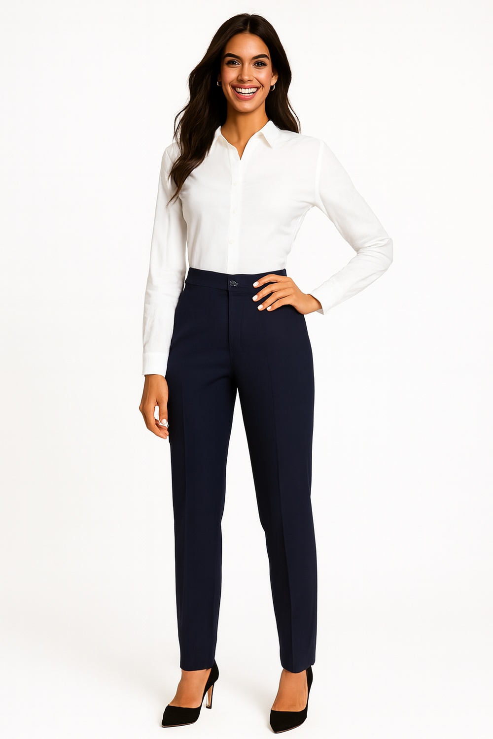Pantalón de pretina ancha con pasadores reforzados que aseguran un mejor ajuste, cierre frontal con botón metálico y cremallera oculta que aportan practicidad, bolsillos discretos laterales que ofrecen funcionalidad, corte recto con planchado permanente al frente que estiliza la figura y alarga visualmente las piernas, confección en tela estructurada que mantiene la forma y aporta comodidad para el día a día o eventos semi formales