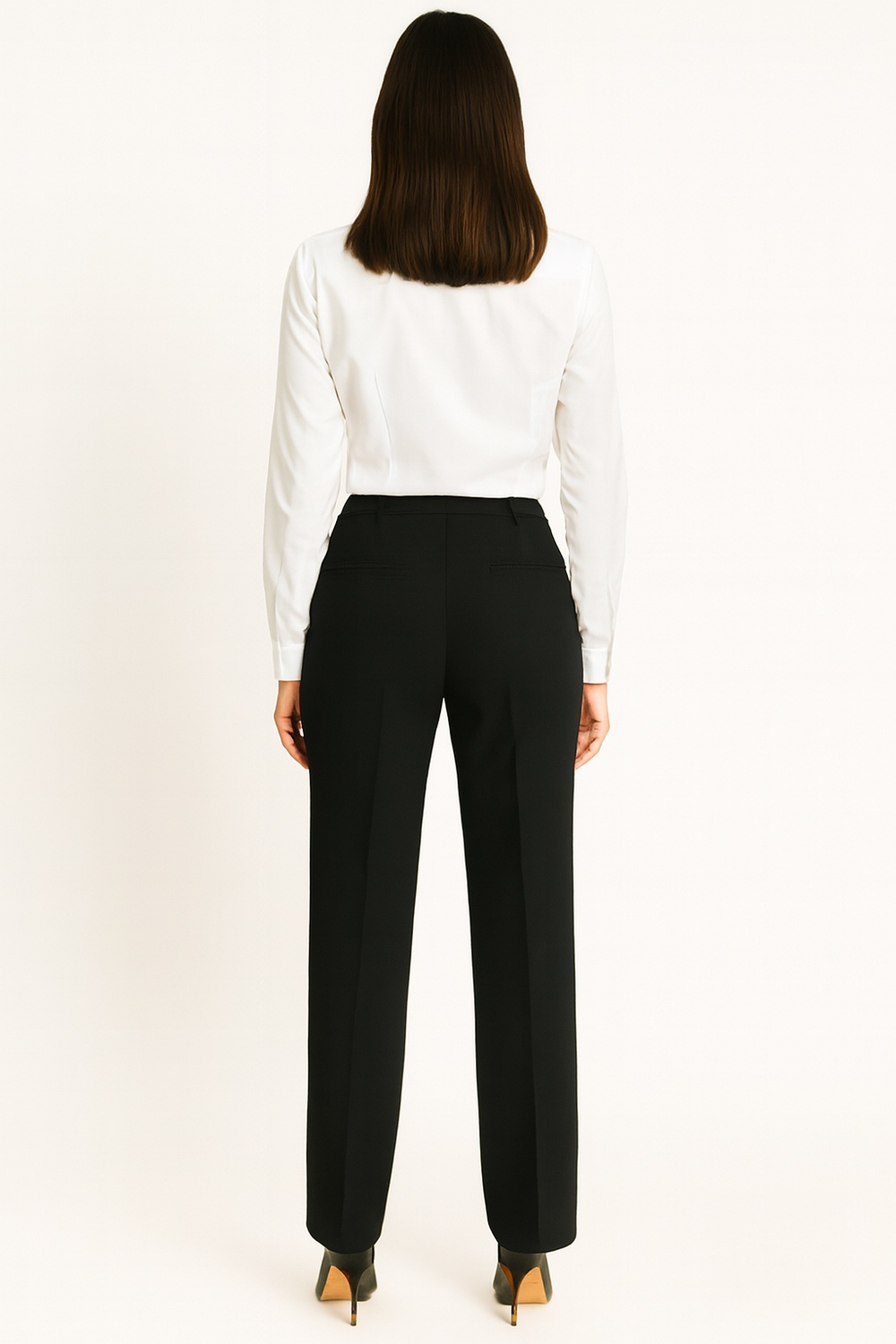 Pantalón de corte recto con pretina y trabillas para cinturón, pinzas frontales que definen la estructura del diseño, bolsas laterales discretas y cierre frontal con gancho oculto, caída firme que proyecta una imagen pulida, confeccionado en tela de tacto suave con cuerpo estructurado