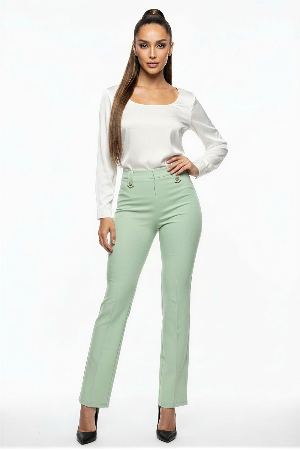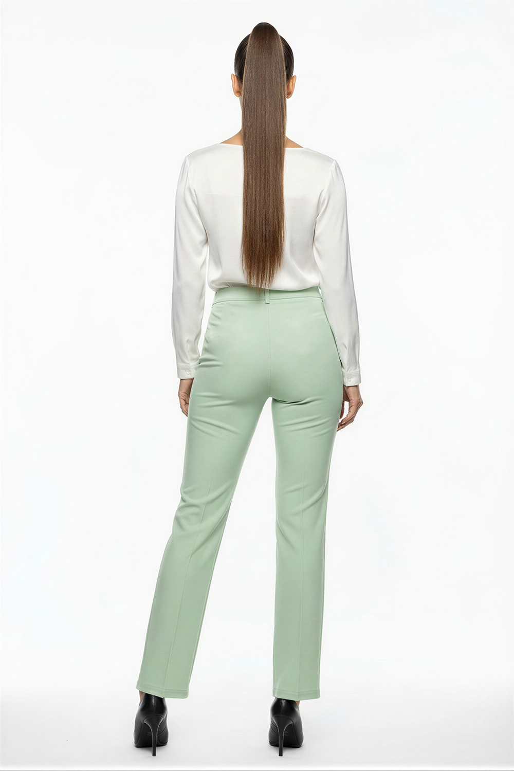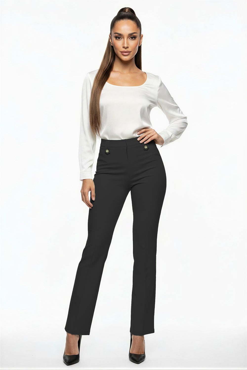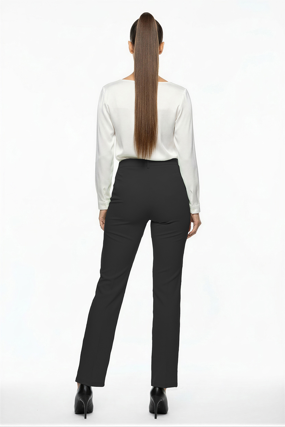 Pantalón de tiro medio con corte recto que estiliza la figura, diseño con pespunte frontal que alarga visualmente la pierna, pretina con trabillas y botón decorativo lateral que aporta ajuste firme, cierre frontal oculto que brinda acabado limpio, confección en tela estructurada que mantiene la forma y ofrece comodidad durante el uso