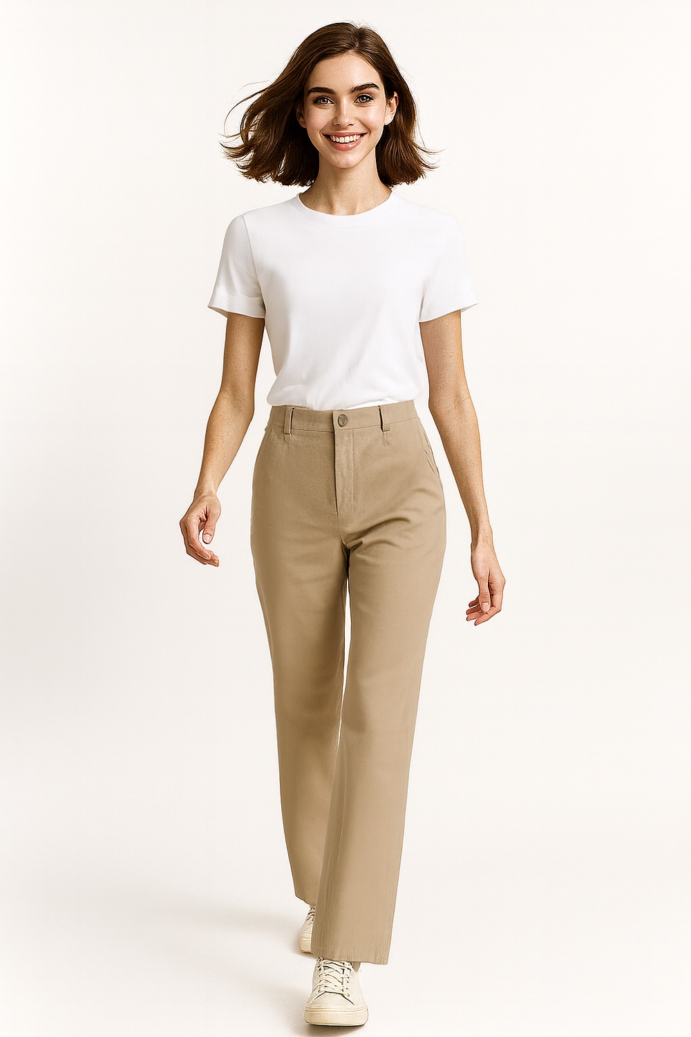 Pantalón de gabardina stretch con corte recto y estructura firme que define la silueta sin limitar el movimiento, diseño con bolsillos frontales tipo fuelle y detalle decorativo en costados que aportan funcionalidad y estilo utilitario, pretina con botón y cierre clásico que enmarca la cintura, estilo casual, urbano
