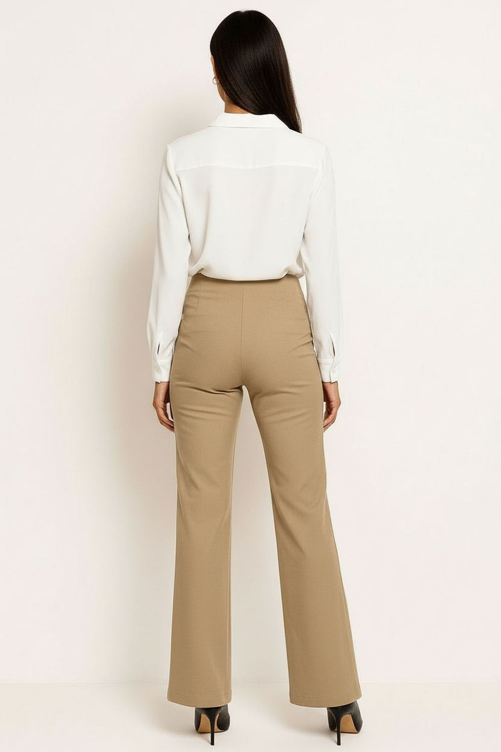 Pantalón de vestir con pretina amplia y detalle de pespunte decorativo que define la cintura, cierre frontal con botón que asegura ajuste práctico, corte recto de largo completo que estiliza la silueta, bolsillos funcionales que aportan utilidad diaria, confección firme que mantiene estructura y presencia formal