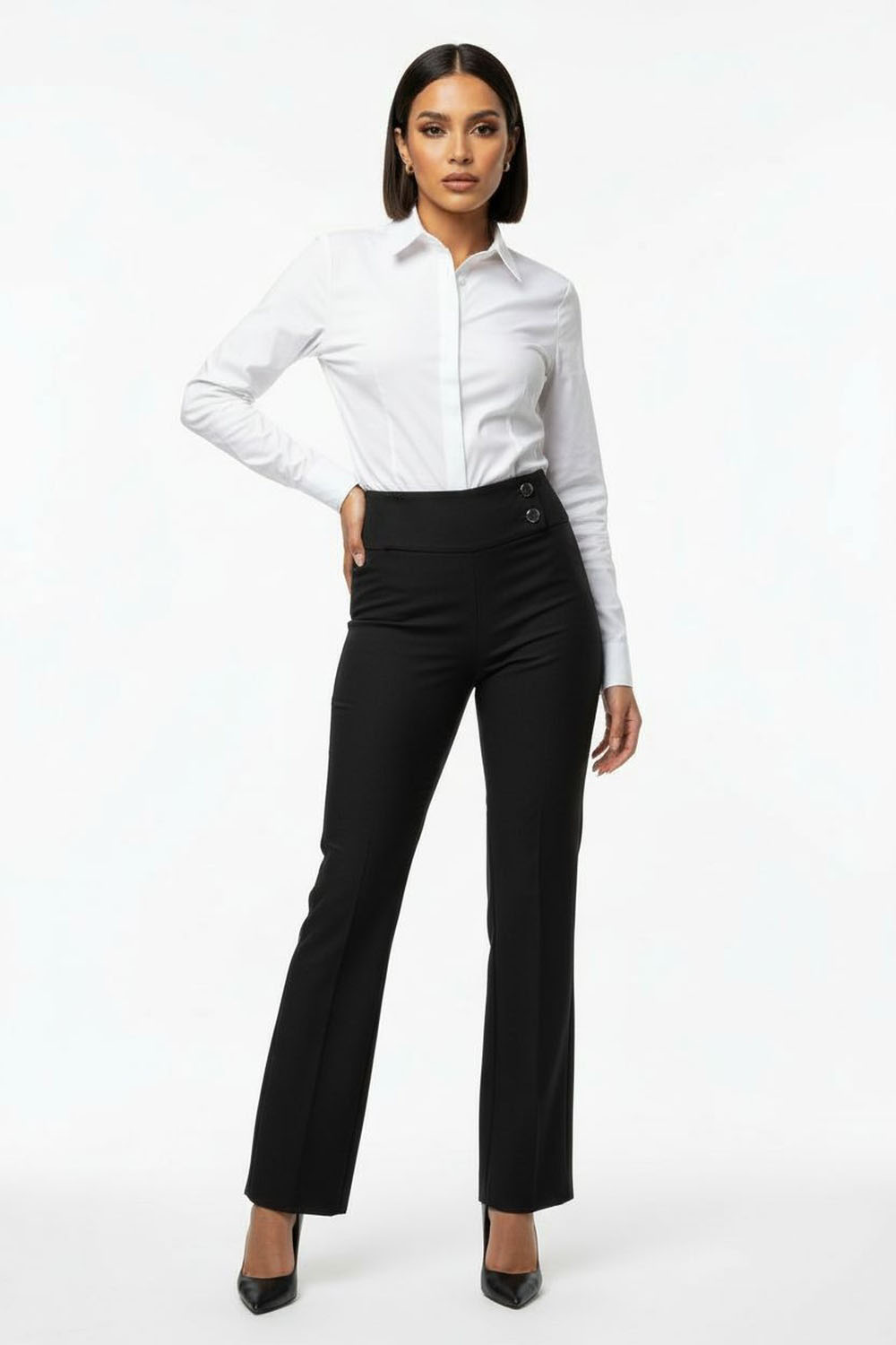 Pantalón de tiro alto con pretina ancha de diseño estructurado y doble botón decorativo que define la cintura, corte recto con ajuste cómodo en cadera y muslo que favorece movilidad, bolsillos delanteros funcionales que aportan practicidad diaria, confección en tejido firme de textura suave que mantiene su forma, largo completo con acabado limpio que proyecta imagen pulida