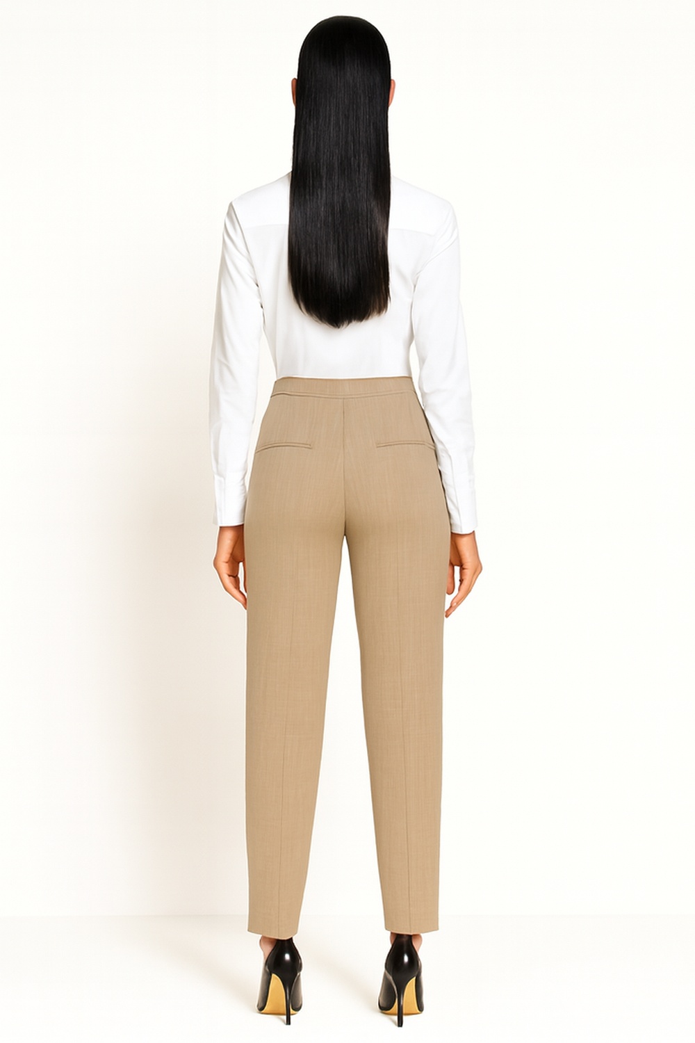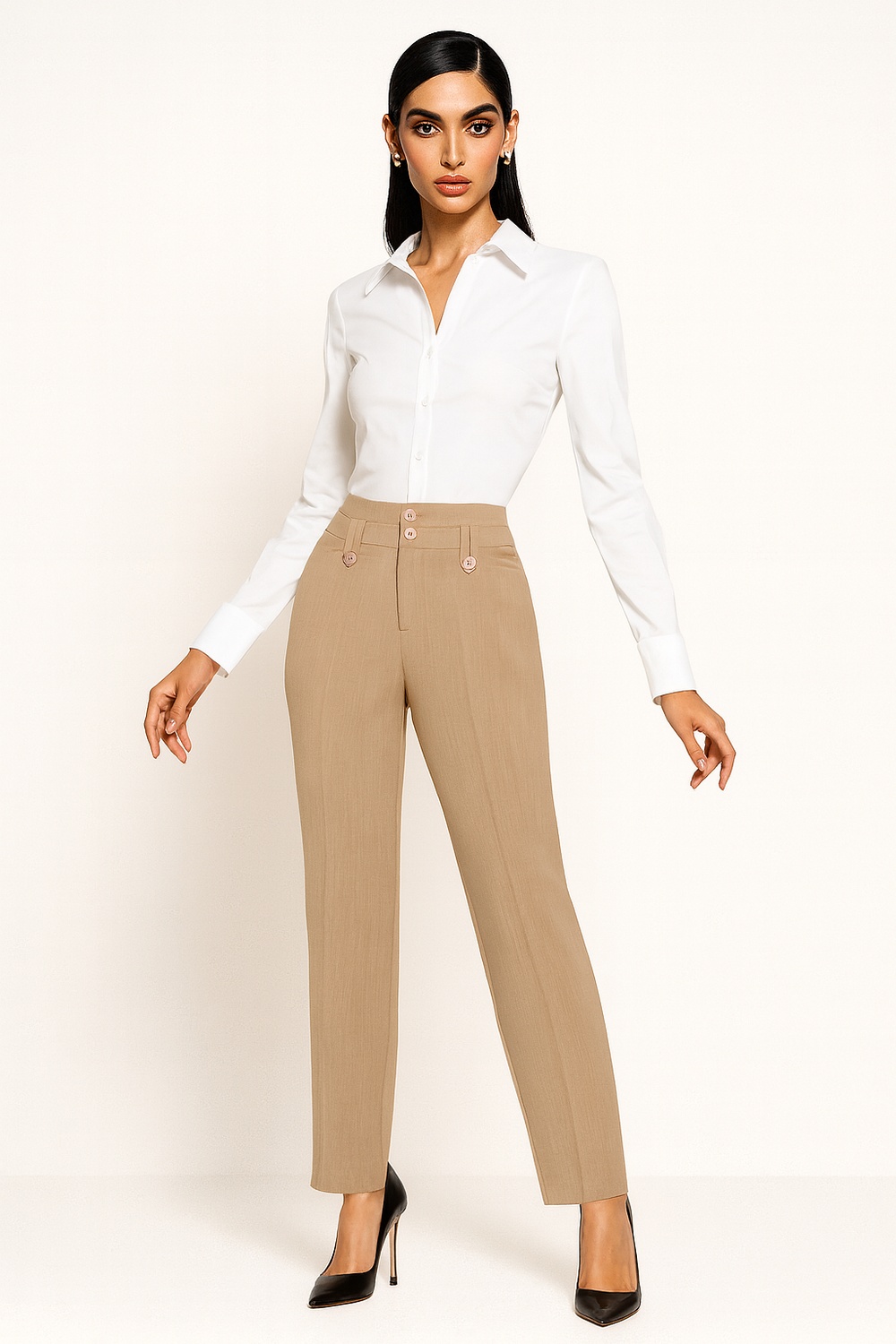 Pantalón de vestir con pretina amplia y detalle de pespunte decorativo que define la cintura, cierre frontal con botón que asegura ajuste práctico, corte recto de largo completo que estiliza la silueta, bolsillos funcionales que aportan utilidad diaria, confección firme que mantiene estructura y presencia formal