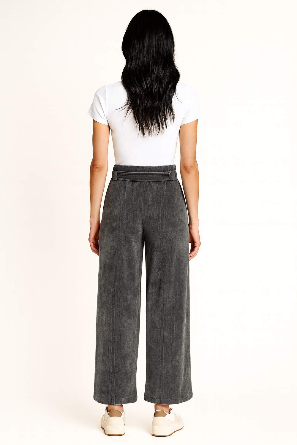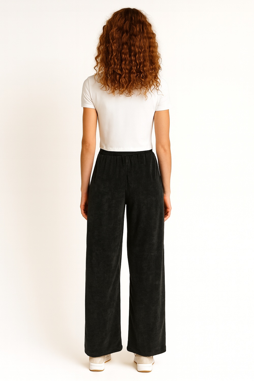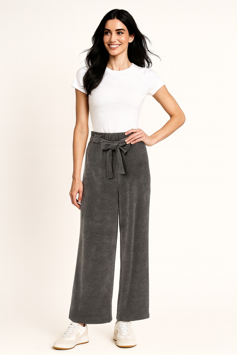 Pantalón tipo mallón con pretina ancha y cinta decorativa que define la cintura, corte amplio con caída fluida que brinda confort, bolsillos laterales funcionales y confección en tejido afelpado suave al tacto perfecto para looks relajados