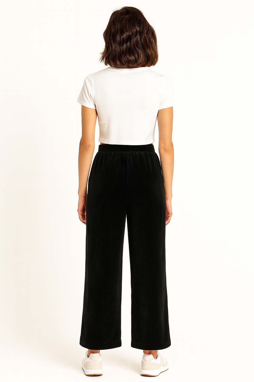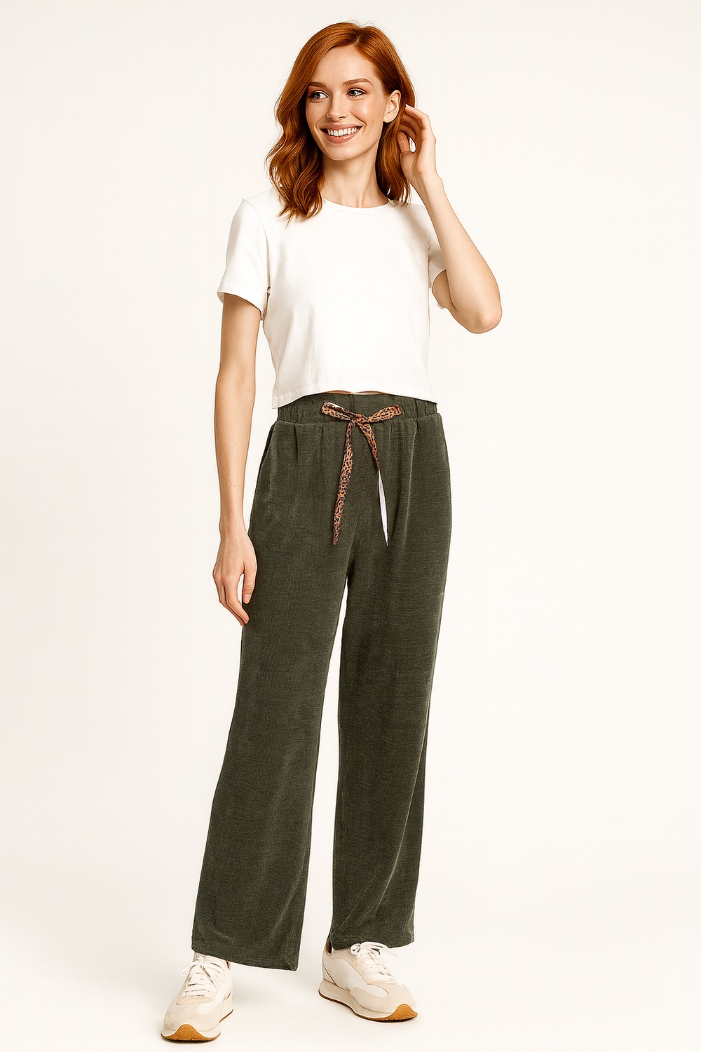 Pantalón de corte amplio con pretina elástica posterior que brinda comodidad, cinta delantera para anudar que permite un ajuste personalizado, confección en tejido ligero con caída fluida que favorece la movilidad, largo completo que estiliza la silueta y terminados prolijos que aportan un acabado moderno y versátil
