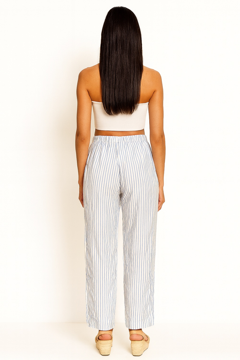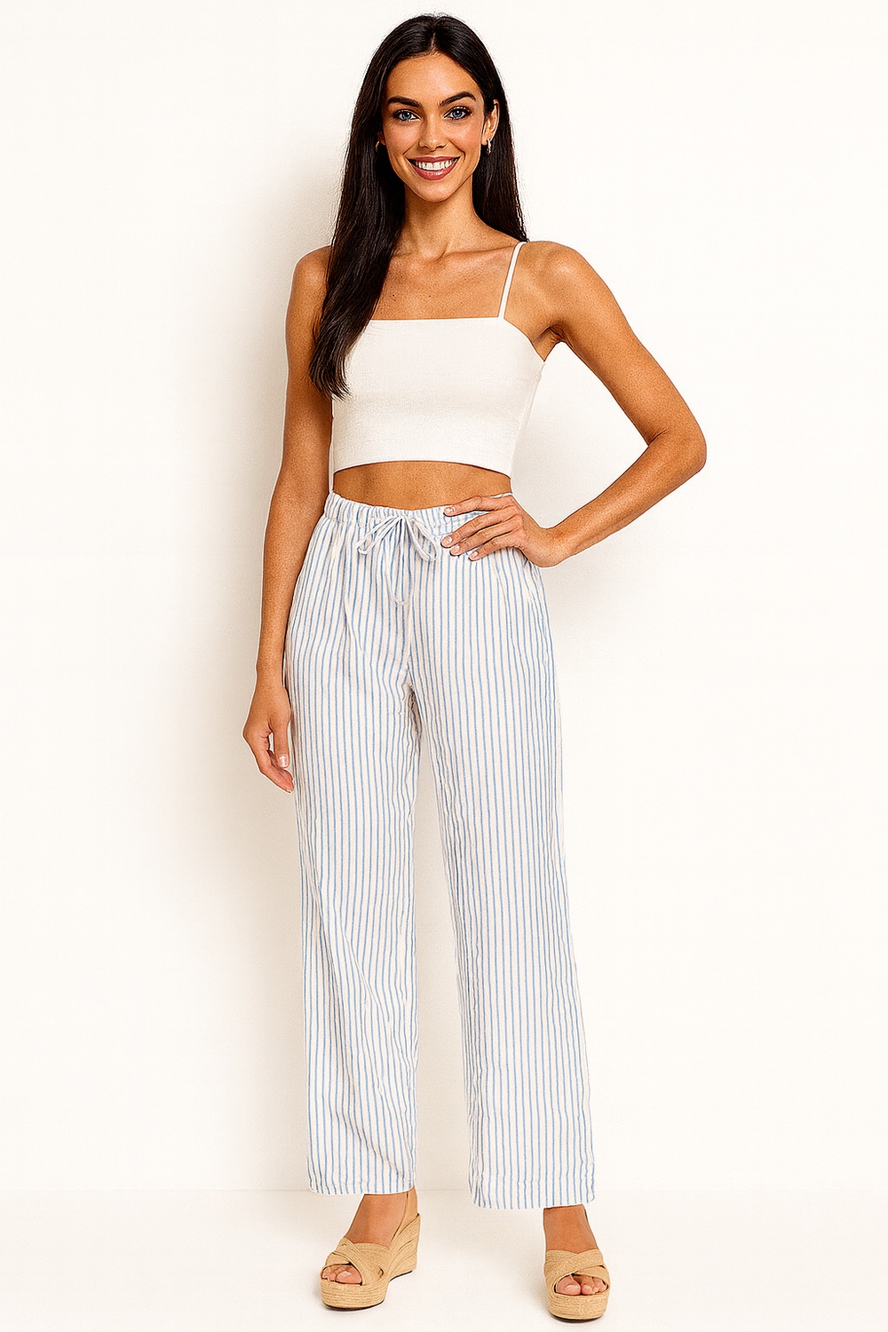 Pantalón de tiro alto con corte suelto y caída recta, confección en tejido ligero que permite movilidad, pretina con resorte y jareta ajustable que brinda ajuste cómodo, largo completo que estiliza la silueta, terminaciones limpias en bastilla para un acabado prolijo