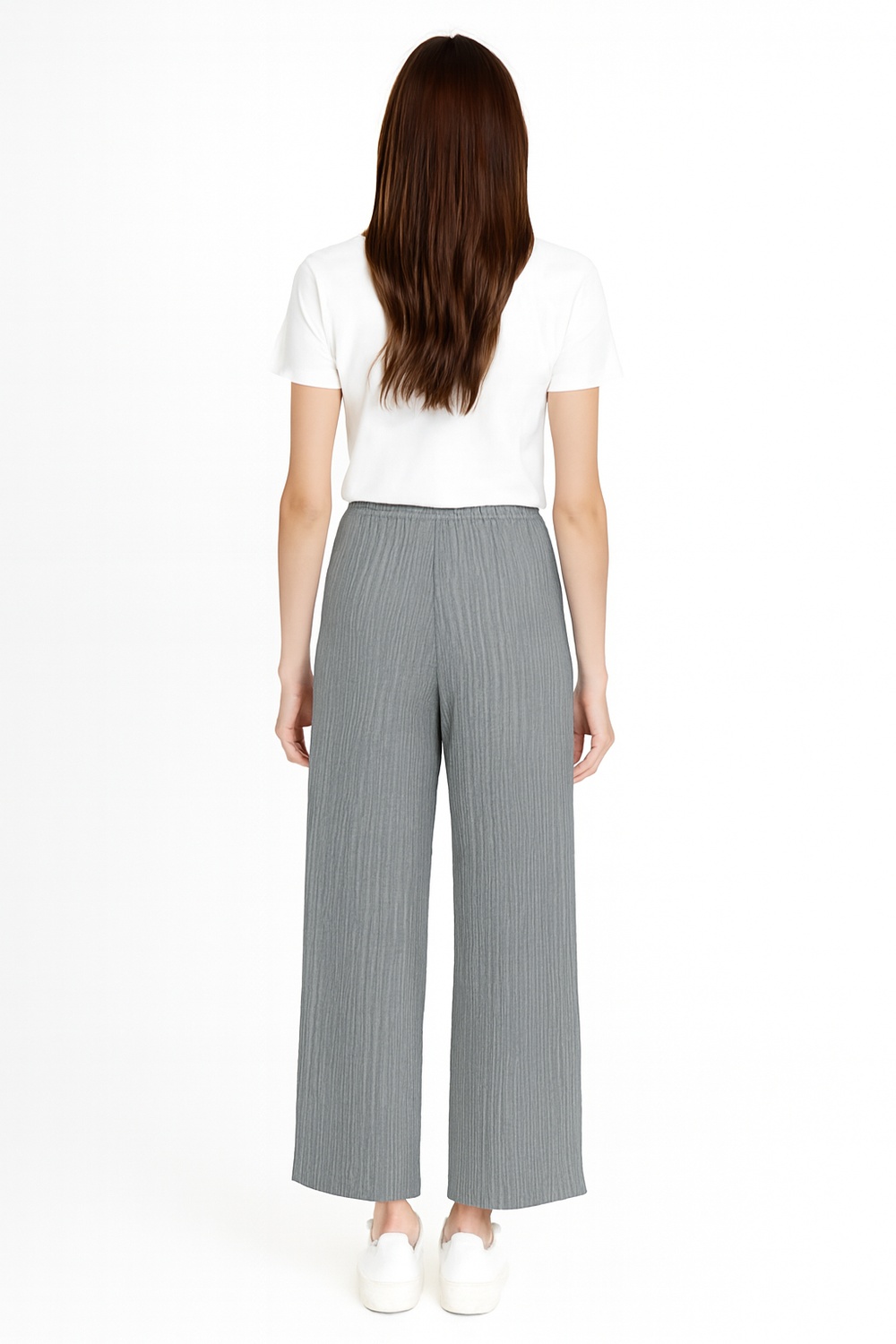 Pantalón de tejido rib con pretina ancha que asegura ajuste cómodo, corte amplio y ligeramente acampanado que estiliza y aporta movimiento, diseño versátil ideal para outfits casuales y relajados, confección en algodón con elastano que brinda frescura, elasticidad y confort