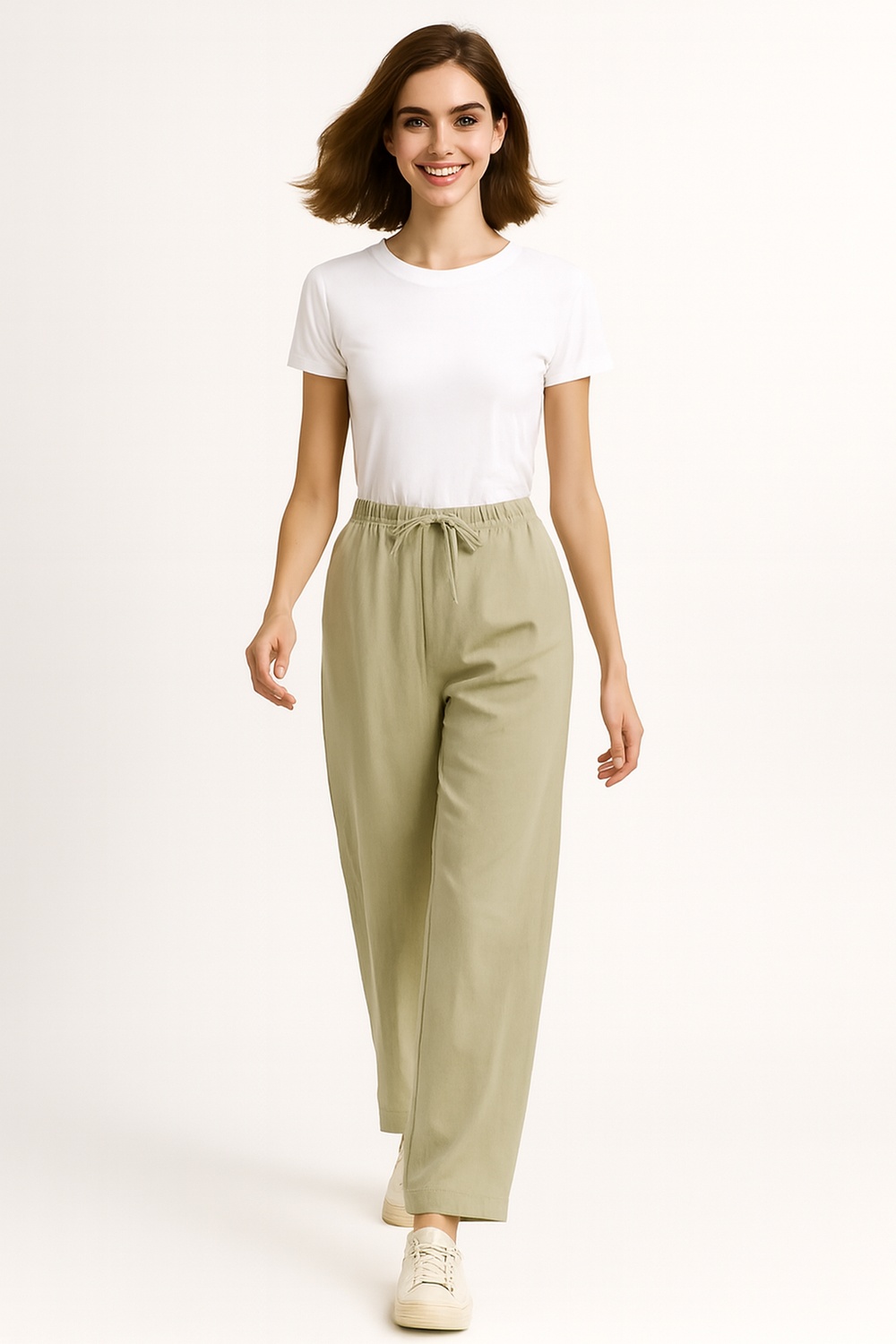 Pantalón de tiro medio con pretina elástica y jareta ajustable, corte amplio en pierna que permite movilidad, largo recto al tobillo con caída ligera, confección en tejido tipo lino de tacto fresco, acabado limpio con ajuste relajado