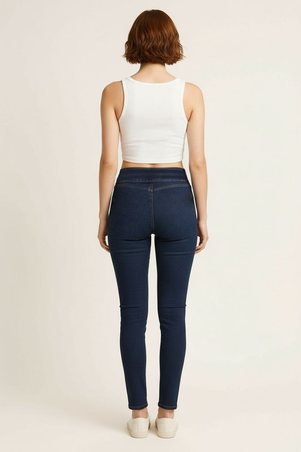 Pantalón de tiro alto con pretina estructurada y cierre frontal con botones funcionales, corte skinny que define la pierna, confección en mezclilla elástica que brinda ajuste cómodo, bolsillos funcionales y largo completo al tobillo