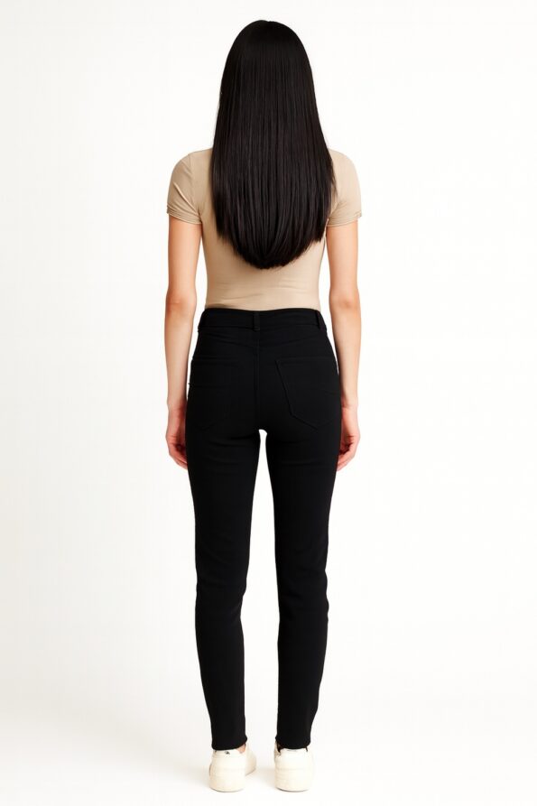Pantalón de tiro alto con corte skinny que realza la silueta, cintura ancha que define la figura y brinda soporte, diseño con bolsillos funcionales en la parte trasera que estilizan visualmente, confección en tejido elástico que ofrece ajuste perfecto y libertad de movimiento, acabado liso que aporta un toque moderno y versátil