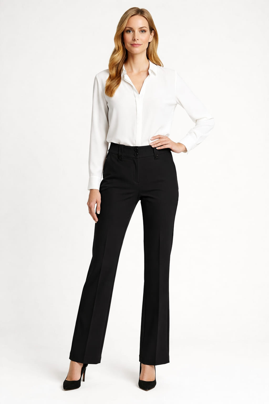 Pantalón de tiro alto con pretina ancha estructurada con botones metálicos al frente que aportan firmeza al ajuste, corte recto que permite caída fluida en la pierna, pinzas frontales que mejoran la forma en la zona superior, acabado limpio en dobladillo para una apariencia más pulida, fabricado en tejido suave con ligera elasticidad que brinda comodidad durante el movimiento