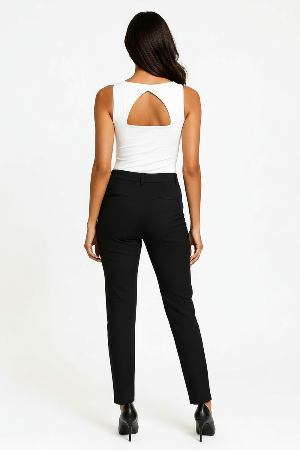 Blusa sin mangas con escote en V tanto al frente como en la espalda que aporta un detalle femenino, hombros decorados con volantes que realzan el diseño, confección en tejido ligero de caída fluida que brinda frescura y comodidad, corte recto que favorece distintas siluetas, acabados cuidados que destacan su estilo moderno