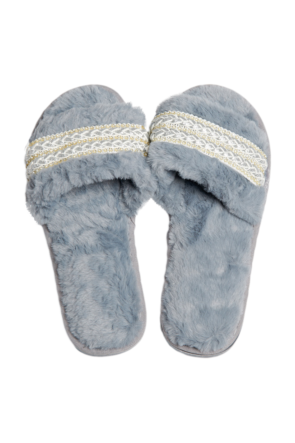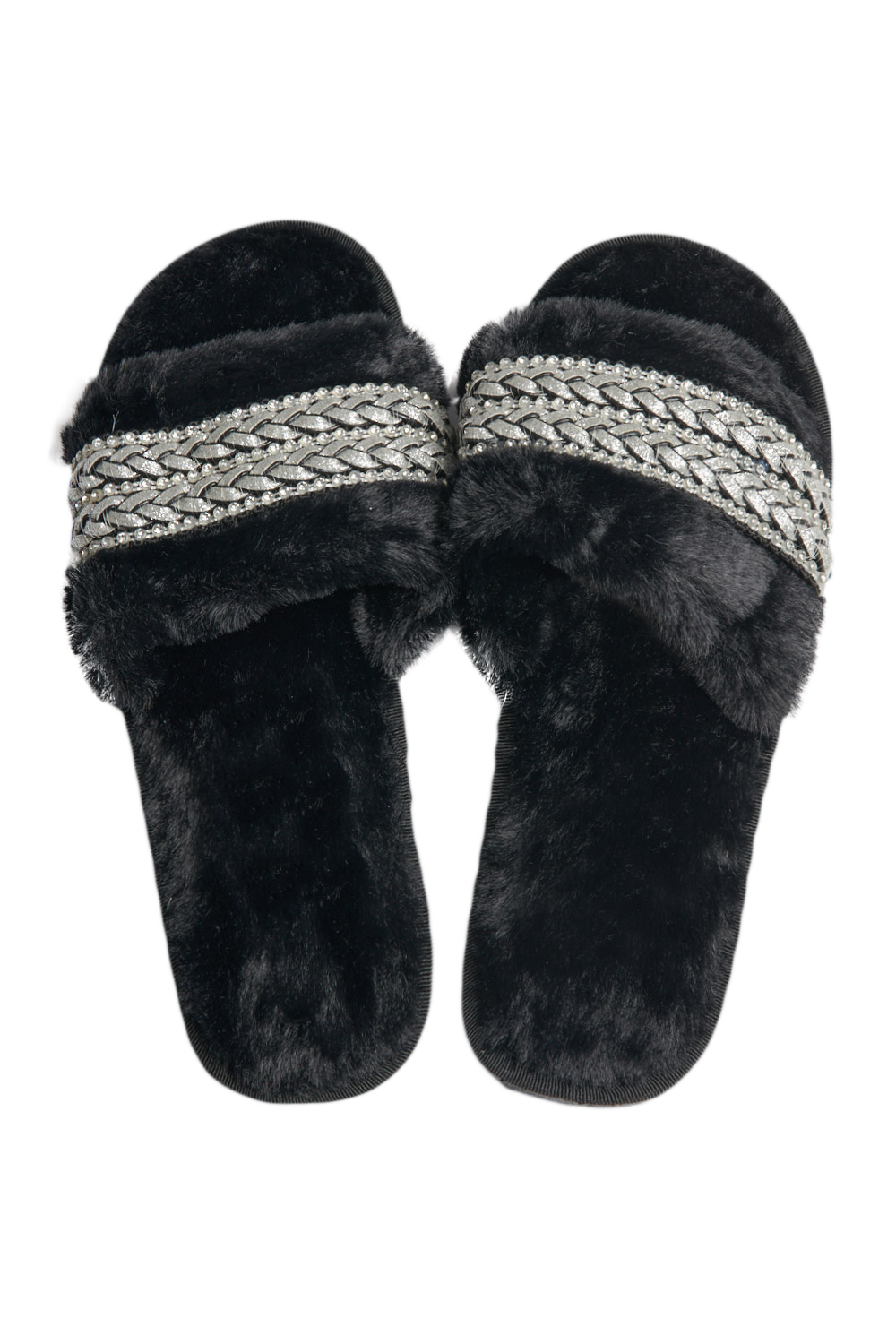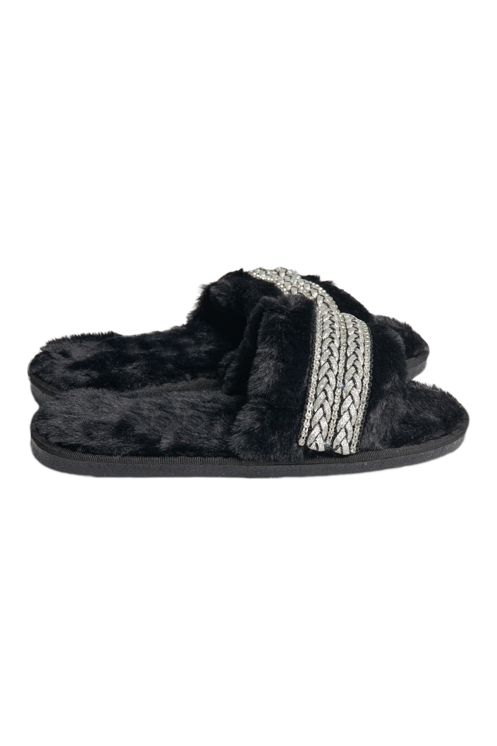 Pantufla de peluche con tira ancha decorada con aplicación de piedras brillantes que aportan elegancia y modernidad, interior forrado en material suave que ofrece máxima comodidad, plantilla acolchonada que garantiza una pisada ligera, suela antideslizante que brinda seguridad al caminar dentro del hogar