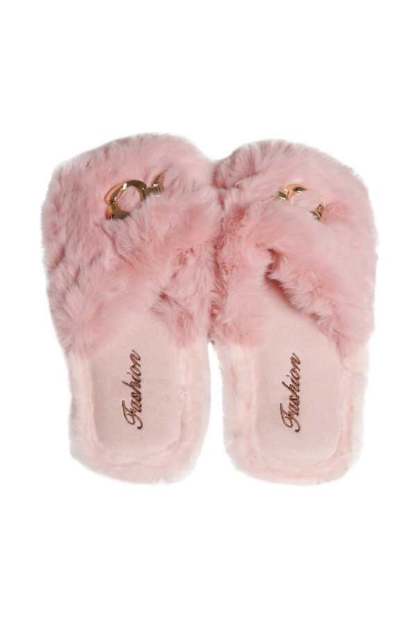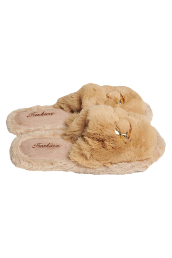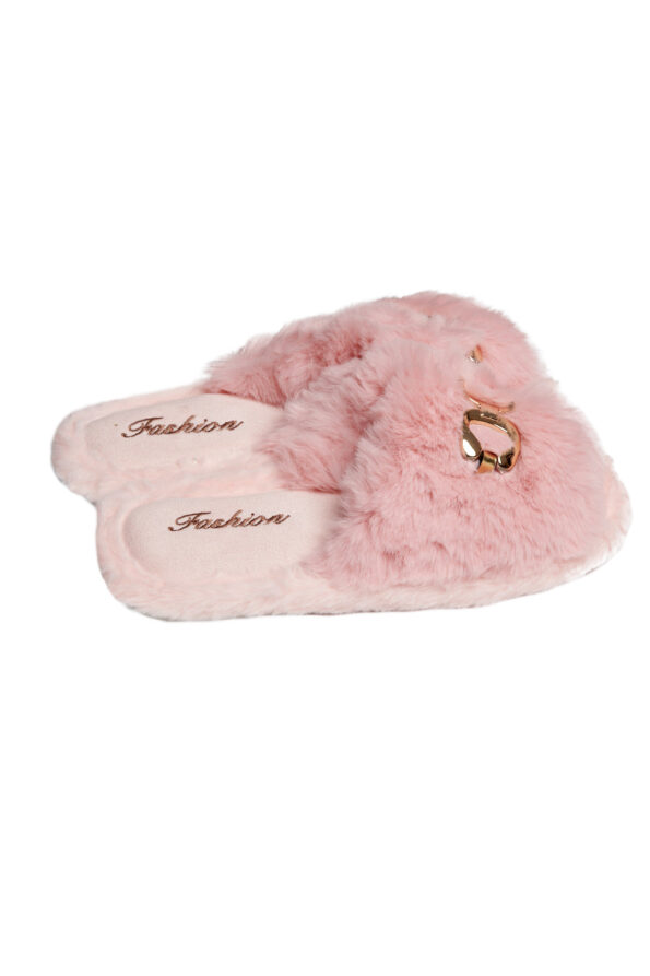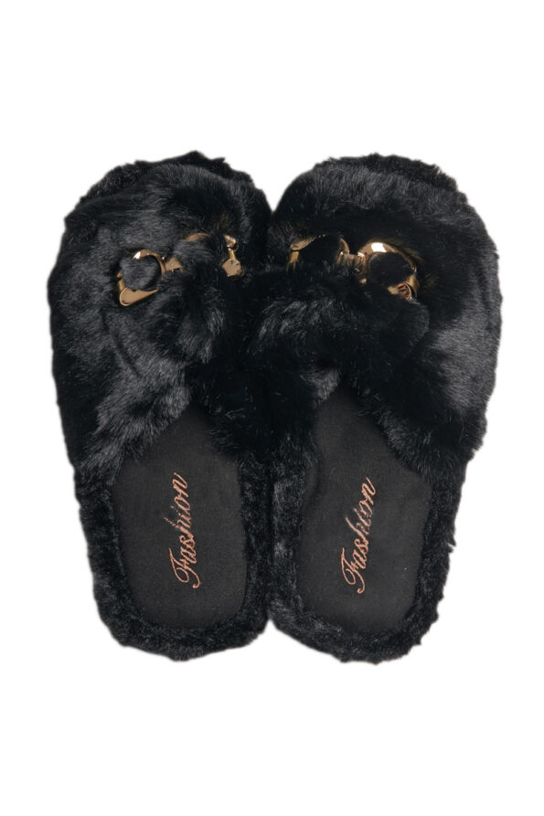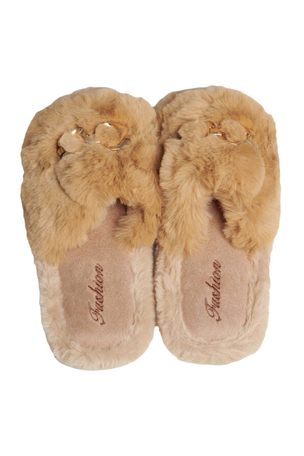 Pantufla de peluche con tira ancha adornada con herraje dorado decorativo que aporta un toque elegante, interior forrado en material suave que brinda sensación de calidez y confort, plantilla acolchonada que garantiza descanso al caminar, suela ligera con textura antideslizante que ofrece seguridad y estabilidad