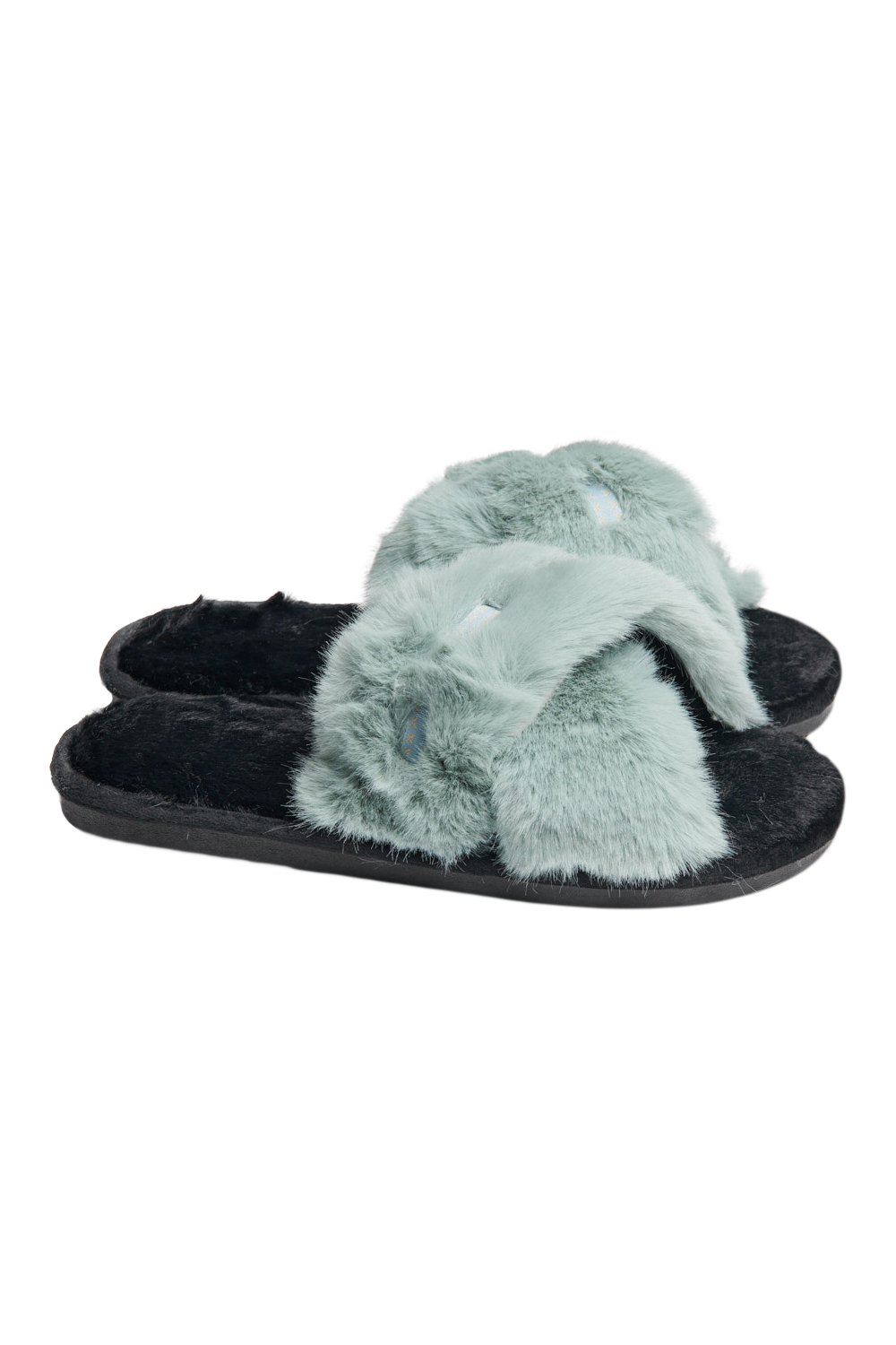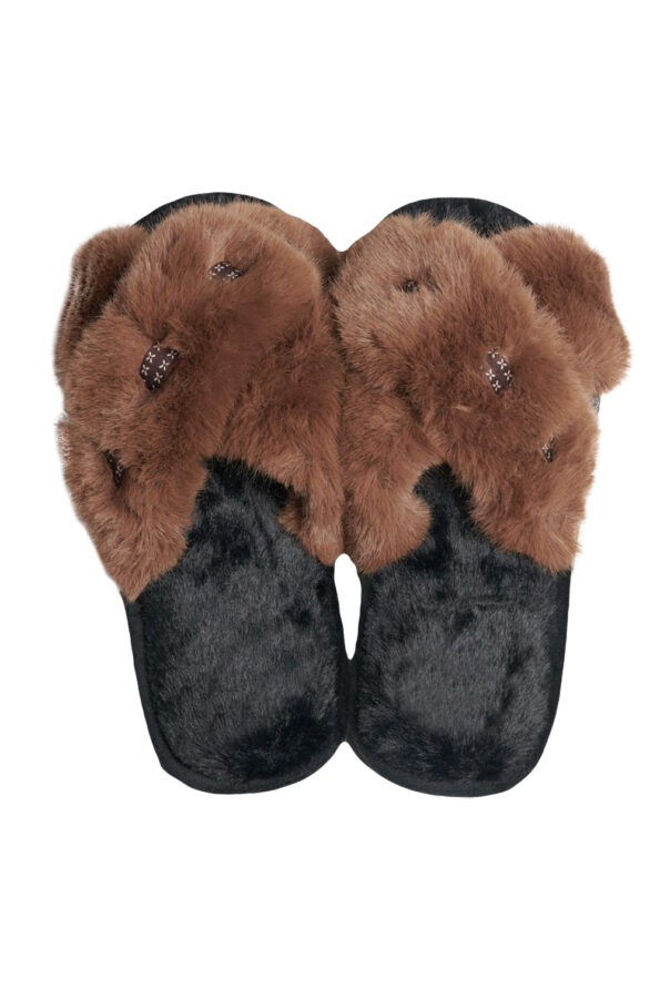 Pantufla tipo sandalia con tiras cruzadas elaboradas en peluche suave que brinda una sensación cálida y confortable, plantilla acolchonada que ofrece soporte y comodidad al caminar, suela ligera con textura antideslizante que garantiza estabilidad, diseño moderno y práctico ideal para descansar con estilo dentro del hogar