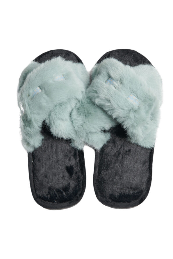 Pantufla de peluche con tira ancha decorada con aplicación de piedras brillantes que aportan elegancia y modernidad, interior forrado en material suave que ofrece máxima comodidad, plantilla acolchonada que garantiza una pisada ligera, suela antideslizante que brinda seguridad al caminar dentro del hogar
