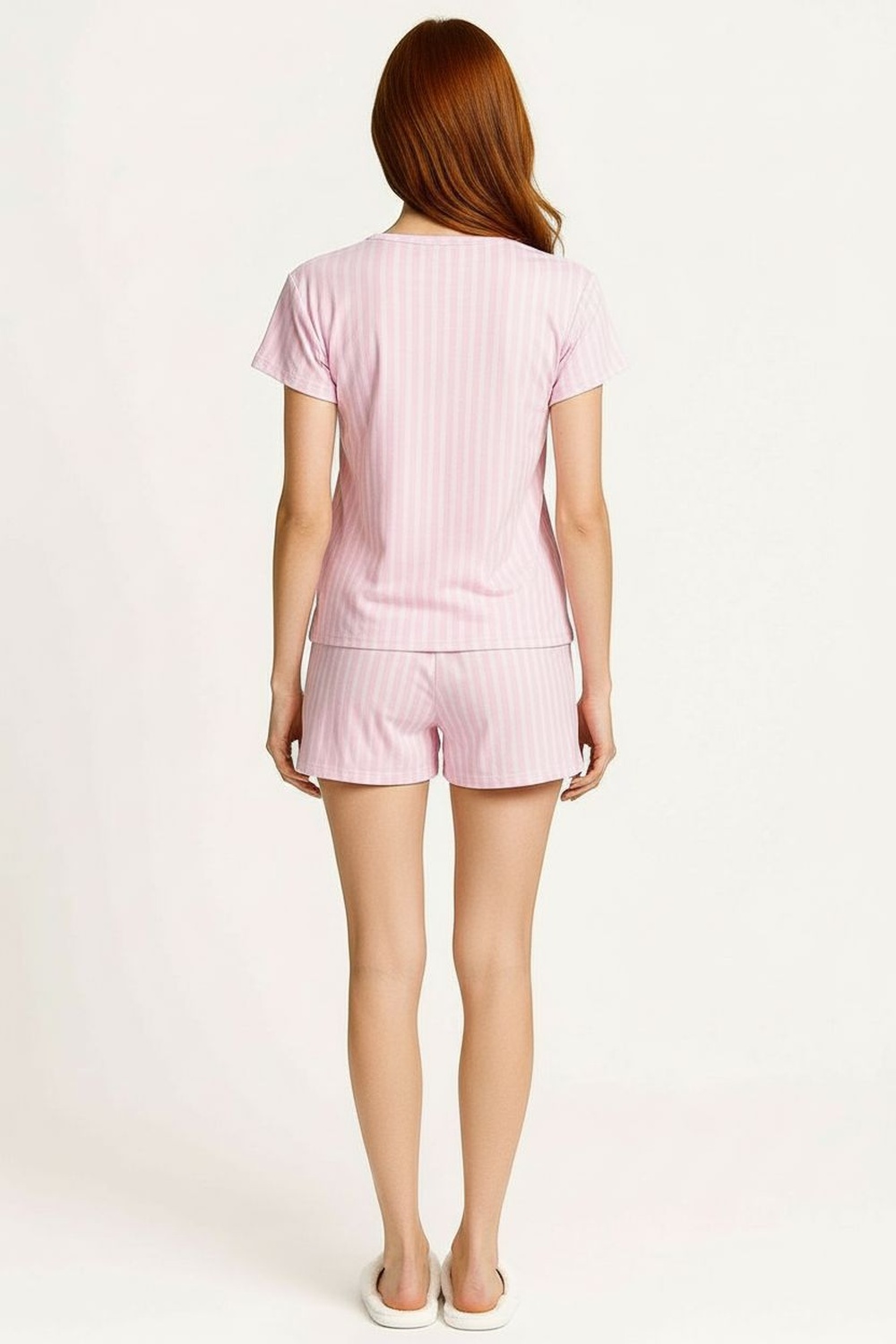 Pijama con playera de manga corta y cuello redondo que ofrece ajuste cómodo en la parte superior, short con pretina elástica y jareta ajustable que se adapta fácilmente a la cintura, corte relajado que brinda libertad de movimiento, confección en tela suave y ligera que aporta frescura al descansar, diseño coordinado que combina practicidad y confort para uso en casa