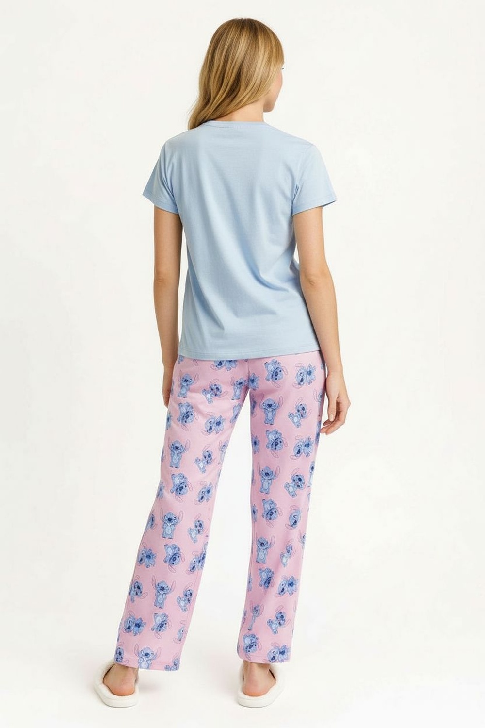Pijama de dos piezas con playera estampada de Lilo & Stitch que aporta un estilo divertido y relajado, short con estampado full print que complementa el conjunto con frescura, corte cómodo ideal para descanso y uso en casa, confección en tejido brush suave al tacto que asegura confort y elasticidad