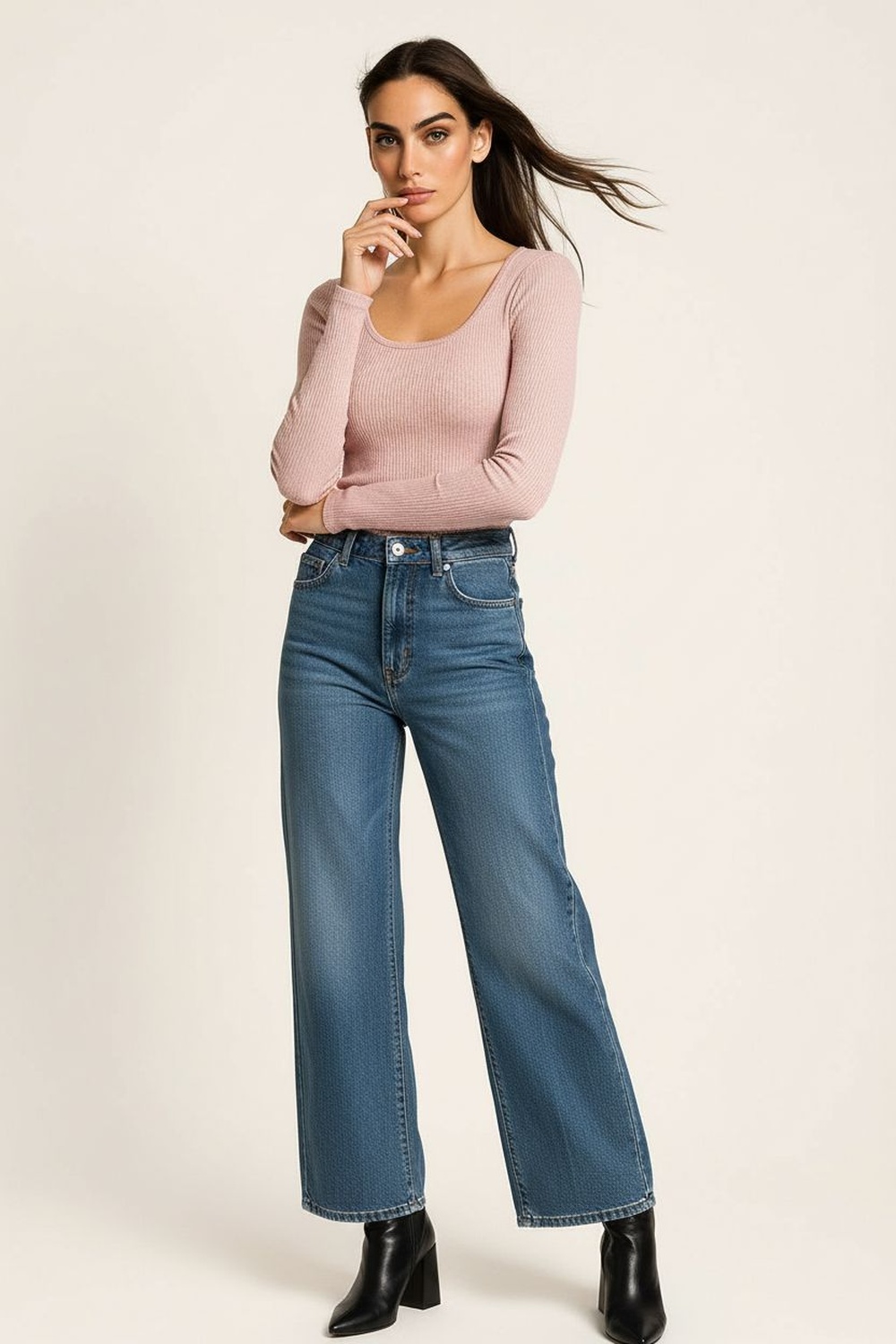 Playera de manga larga con escote amplio y doblez decorativo, confección en tejido rib con acabado brillante, corte corto que resalta la silueta, terminaciones limpias que aportan un aspecto sofisticado y actual