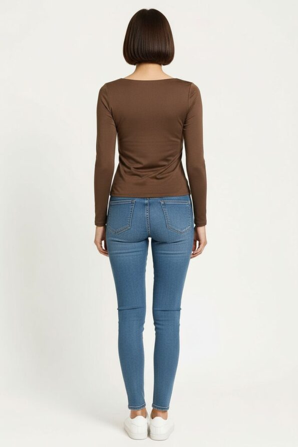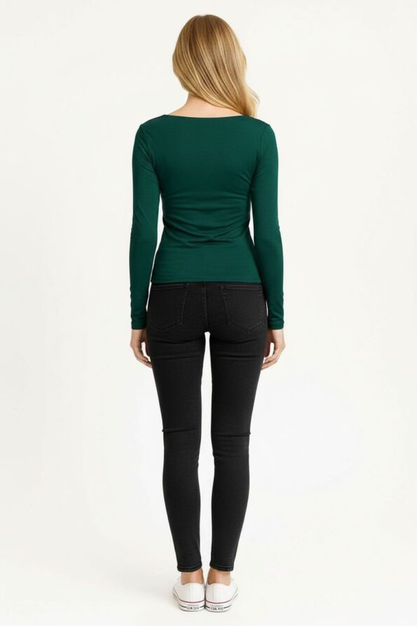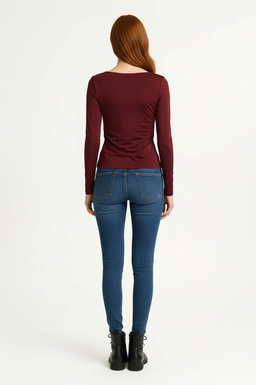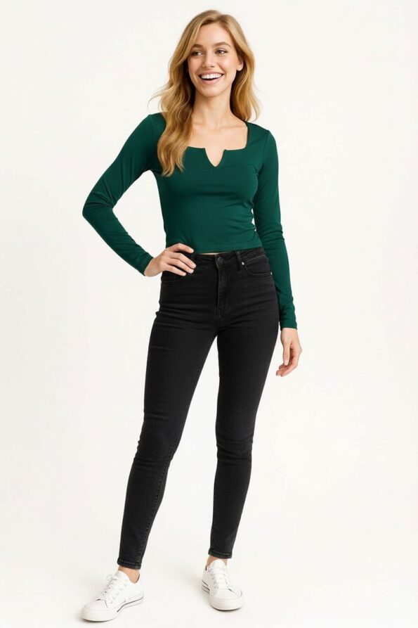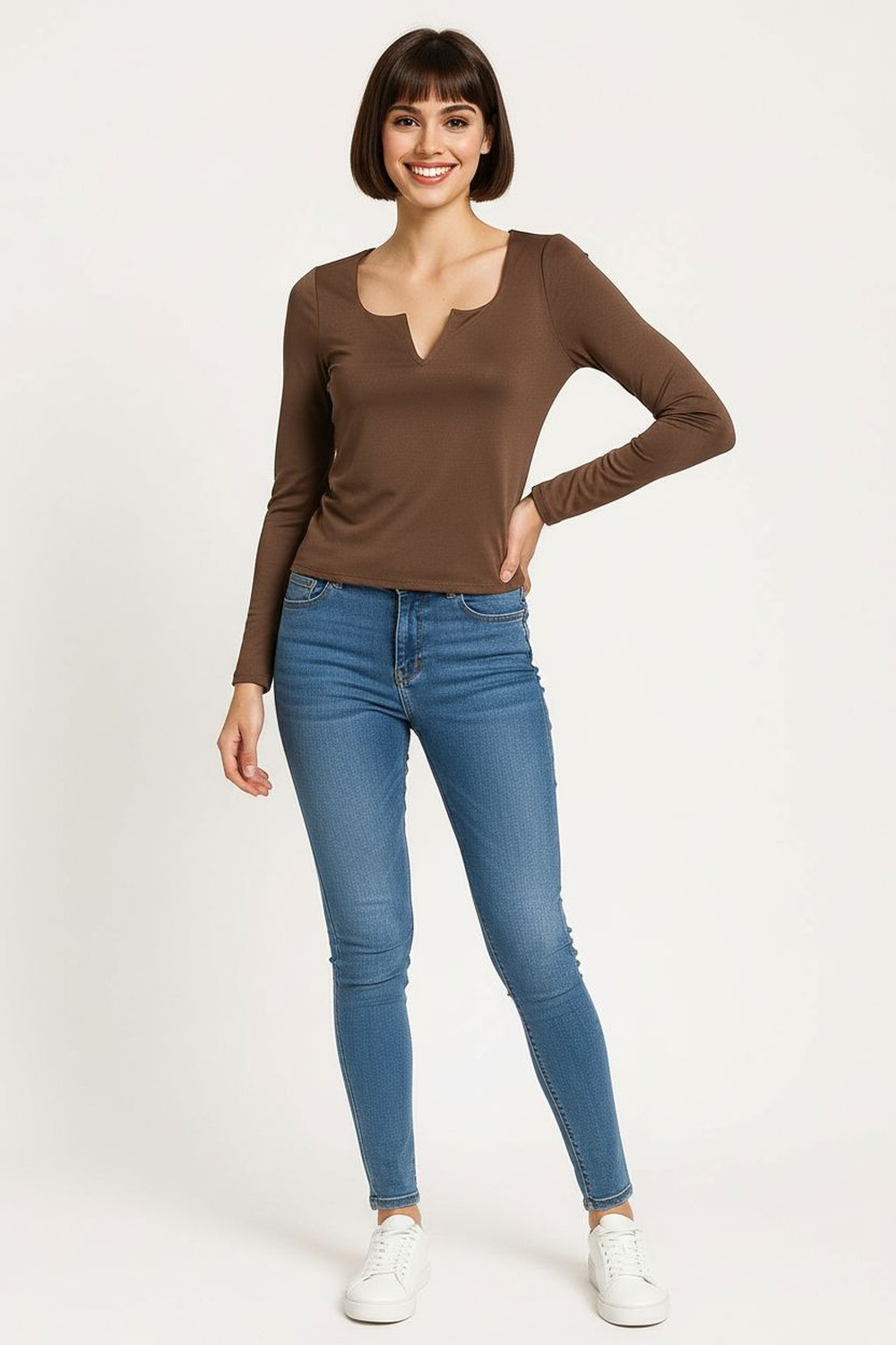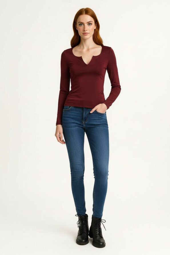 Playera de manga larga con cuello en ojal en forma de V que realza el escote con un diseño atractivo, corte ajustado que estiliza la figura, largo por encima de la cintura que aporta un look moderno y juvenil, confección en tela elástica que se adapta cómodamente al cuerpo brindando suavidad y libertad de movimiento, acabados reforzados que aseguran durabilidad en cada uso