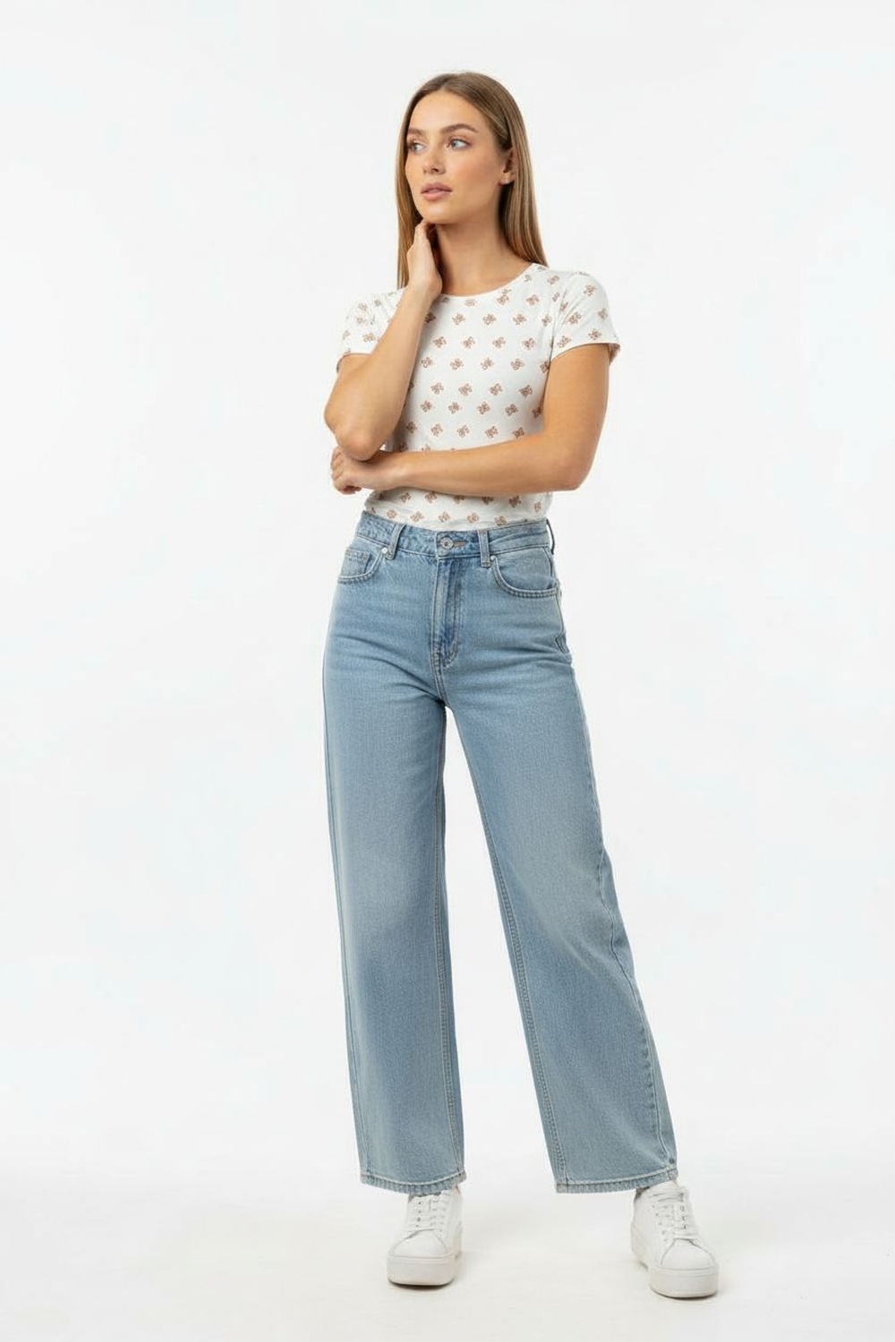 Jeans de tiro alto, cierre frontal con botón, diseño de cinco bolsillos, ajuste en cadera y muslo, pierna con apertura amplia