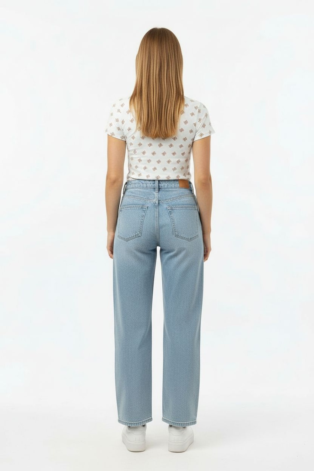Pantalón de mezclilla con diseño clásico de cinco bolsas, tiro medio que proporciona ajuste cómodo, pretina con trabillas y cierre de botón metálico con bragueta de cierre, costuras visibles que realzan la confección, corte recto que ofrece estilo versátil y moderno